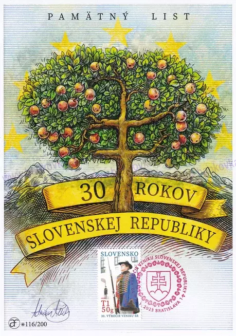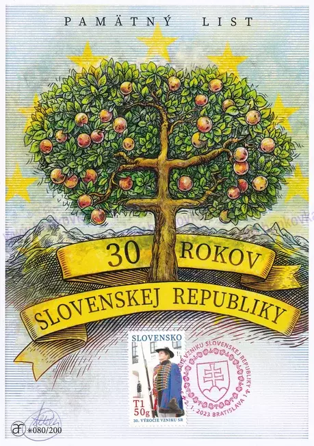 Filatelistický pamätný list bol vytvorený pri príležitosti 30.výročia vzniku samostatnej SR (1.1.1993), motív je identický so slovenským EuroSouvenirom EEAM 2023-6 (ktorého je A.Ferda autorom): košatá jabloň, ktorej kmeň a hlavné konáre tvoria slovenský dvojkríž; počet jej plodov - jabĺk zobrazuje počet rokov samostatnosti SR; jabloň vyrastá zo slovenskej zeme, na obzore ktorej sa za jabloňou týčia slovenské končiare hraničných pohorí SR; na stužke je pripomienka výročia samostatnosti; motív je doplnený príležitostnou slovenskou poštovou známkou č.784/23, príležitostnou poštovou pečiatkou č.01/23 a vlastnoručným podpisom autora, okrem jedinečného číslovania xxx/200 každého PaL pripojil aj svoju autorskú značku "af".