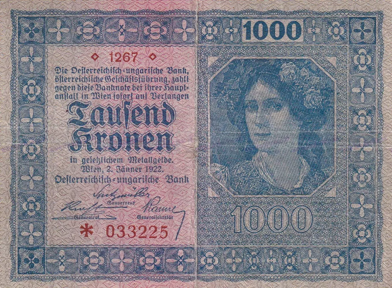 1000 Kronen 1922 neperforovaná (stav 3)