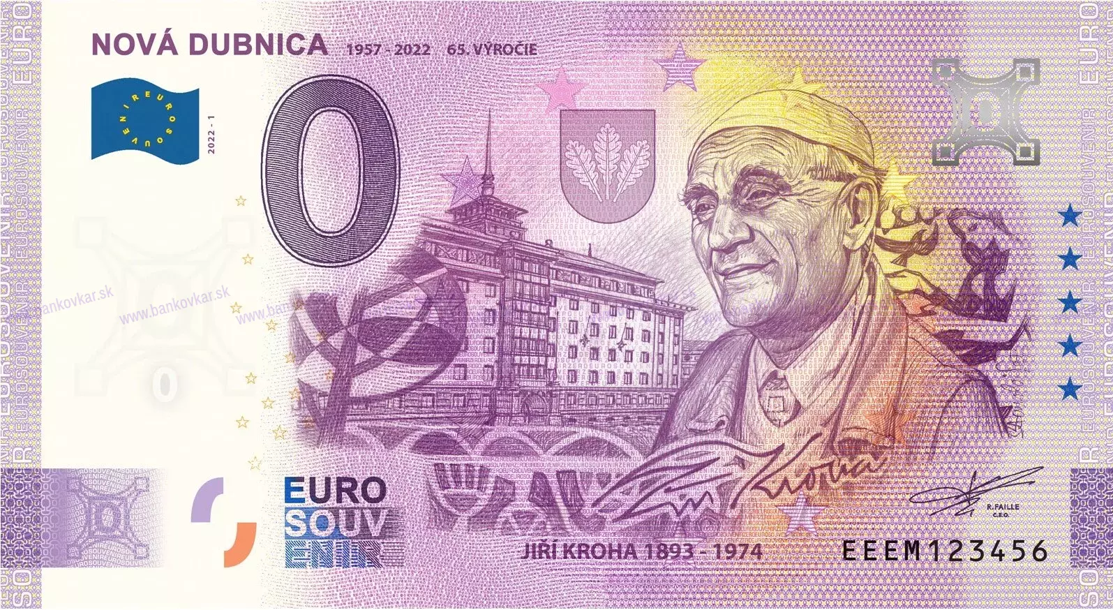 Na motíve je portrét hlavného architekta konceptu výstavby mesta Nová Dubnica Jiřího Krohu, znak mesta, pohľad na prvú postavenú budovu Slobodárne v štýle Sorela a detaily ozdobných prvkov na jednotlivých budovách. Výstavba mesta Nová Dubnica začala v roku 1951 podľa projekčného návrhu vypracovaného umeleckým ateliérom architekta Jiřího Krohu. Vznikla jedinečná architektúra, ktorá dodnes vytvára originálny imidž Novej Dubnice.