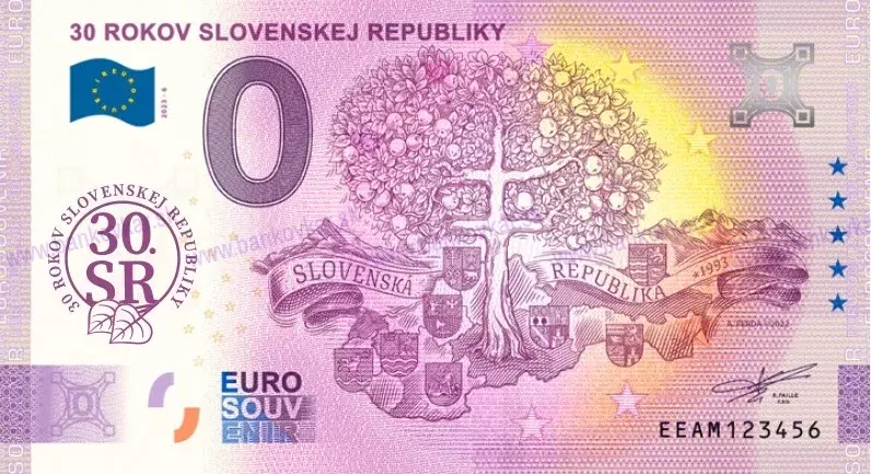 Motívom je košatá jabloň, ktorá má 30 zrelých plodov a kmeň naznačujúci štátny znak Slovenskej republiky. Korene vyrastajú z krajiny - mapy SR. V pozadí je silueta slovenskej krajiny s dominantou Kriváňom a Vysokých Tatier. Mapa Slovenska je doplnená o erby jednotlivých samosprávnych krajov SR.