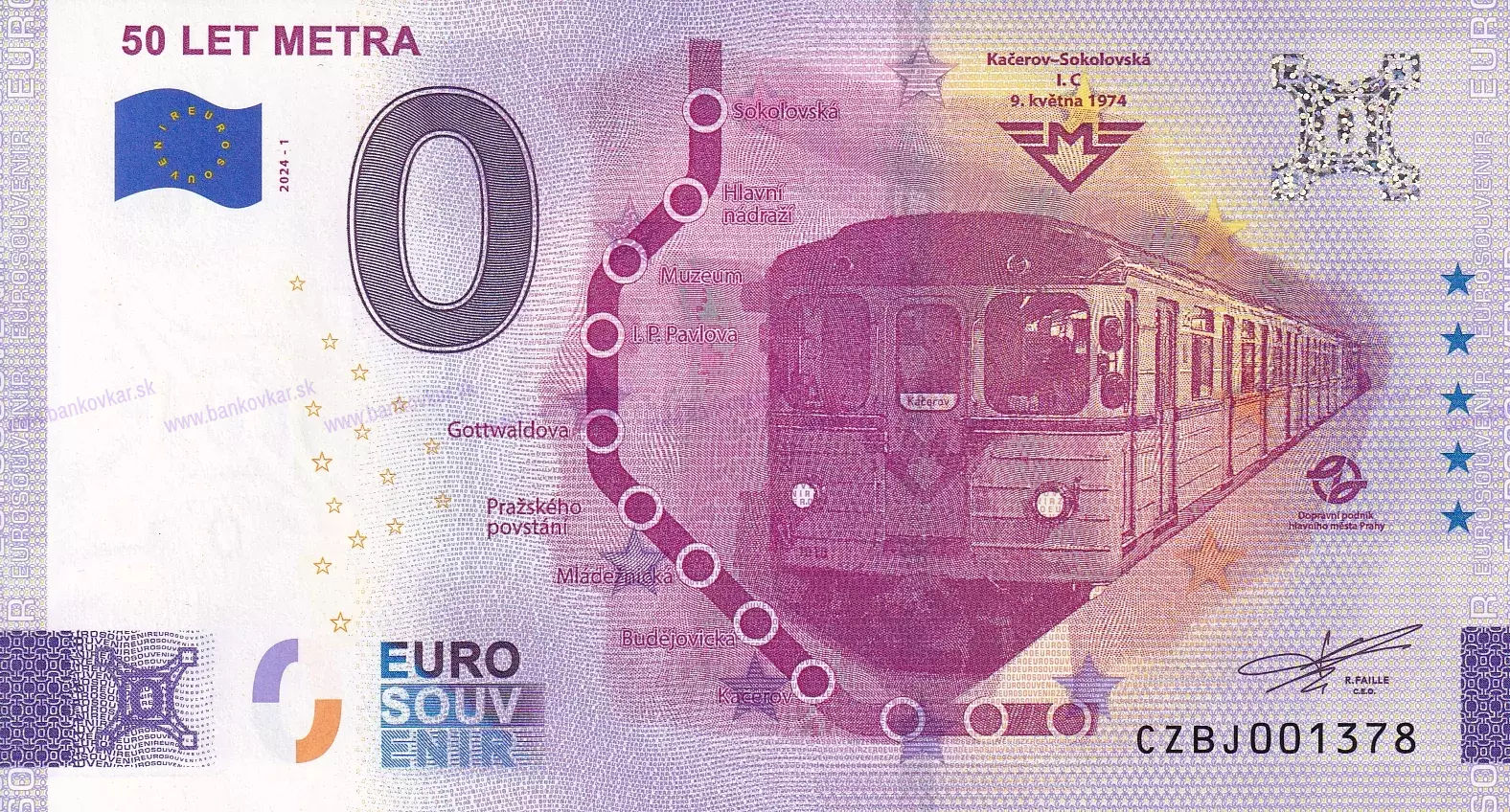 V roku 2024 oslavuje pražské metro 50. výročie spustenia prevádzky. Prvá trasa C, spájajúca Florenc s Kačerovom, bola otvorená 9. mája 1974 a odvtedy sa stala nepostrádateľnou súčasťou pražskej dopravy. Metro prepravilo za svoju históriu vyše 5 miliárd cestujúcich a dnes je piatym najvyťaženejším metrom v Európe. Pôvodná trasa C sa odvtedy rozrástla do troch liniek s celkovo 61 stanicami a dĺžkou 65,4 km. V súčasnosti prebieha výstavba trasy D, ktorá po svojom dokončení v roku 2029 predĺži sieť metra o ďalších 10,4 km a 16 staníc.Na 0 euro suveníre, ktorý okrúhle výročie pripomína, je vedľa historickej súpravy vyobrazený prvý úsek trasy „C“, vrátane pôvodných názvov staníc.