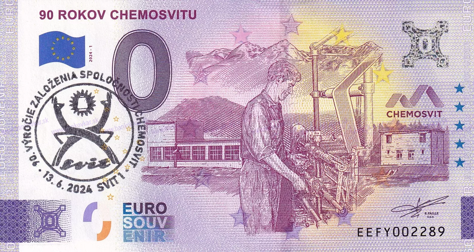 Začiatkom roka 1934 sa na miestach dnešného mesta Svit začala vďaka Tomášovi Baťovi budovať fabrika, ktorá v súčasnosti nesie názov Chemosvit a ktorá je významným tvorcom nielen ekonomického ale aj spoločenského života v regióne. 30.roky boli na zelenej lúke pod Tatrami poznačené prudkým rozvojom výroby o akej dovtedy nebolo ani zmienky – umelého vlákna, striže, celofánu a ďalších sprievodných činností. Skupina Chemosvit je od r.1993 dodnes v rukách pôvodných akcionárov, ktorí významne pracovali na jej rozvíjaní a dnes má značka Chemosvit svoje pevné miesto nielen v regióne, ale aj vo svete. Na suveníre sú vyobrazené: pokusná stanica (prvá výrobná budova), prvý domček s bytom, kanceláriou a vrátnicou, ktorých výstavba začala koncom apríla 1934 a pracovník pri tlačiarenskom stroji.