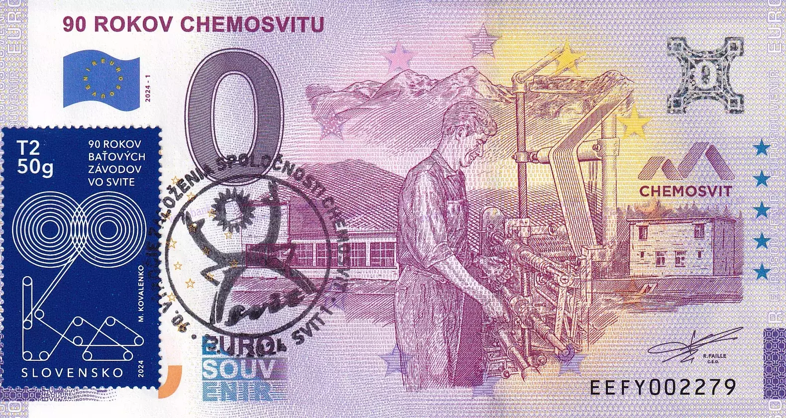 Začiatkom roka 1934 sa na miestach dnešného mesta Svit začala vďaka Tomášovi Baťovi budovať fabrika, ktorá v súčasnosti nesie názov Chemosvit a ktorá je významným tvorcom nielen ekonomického ale aj spoločenského života v regióne. 30.roky boli na zelenej lúke pod Tatrami poznačené prudkým rozvojom výroby o akej dovtedy nebolo ani zmienky – umelého vlákna, striže, celofánu a ďalších sprievodných činností. Skupina Chemosvit je od r.1993 dodnes v rukách pôvodných akcionárov, ktorí významne pracovali na jej rozvíjaní a dnes má značka Chemosvit svoje pevné miesto nielen v regióne, ale aj vo svete. Na suveníre sú vyobrazené: pokusná stanica (prvá výrobná budova), prvý domček s bytom, kanceláriou a vrátnicou, ktorých výstavba začala koncom apríla 1934 a pracovník pri tlačiarenskom stroji.