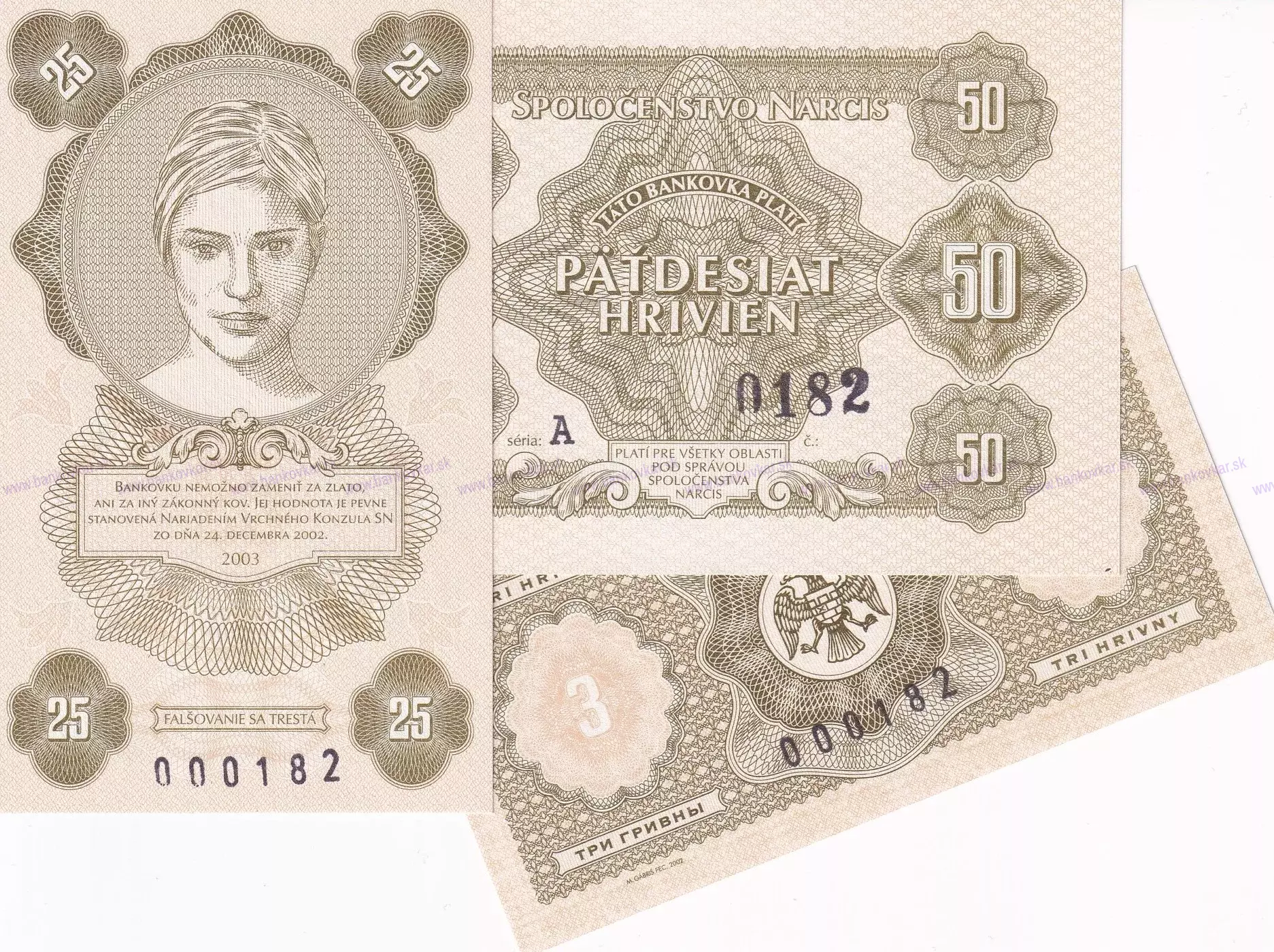 3 Hrivny r. 2002 - 200ks číslované 1 až 200. 25 Hrivny r. 2003 - 400ks číslované 1 az 400. 50 Hrivny r. 2002 - 400ks číslované 1 až 400 -Popis: bez ochranných prvkov a ručný číslovač
