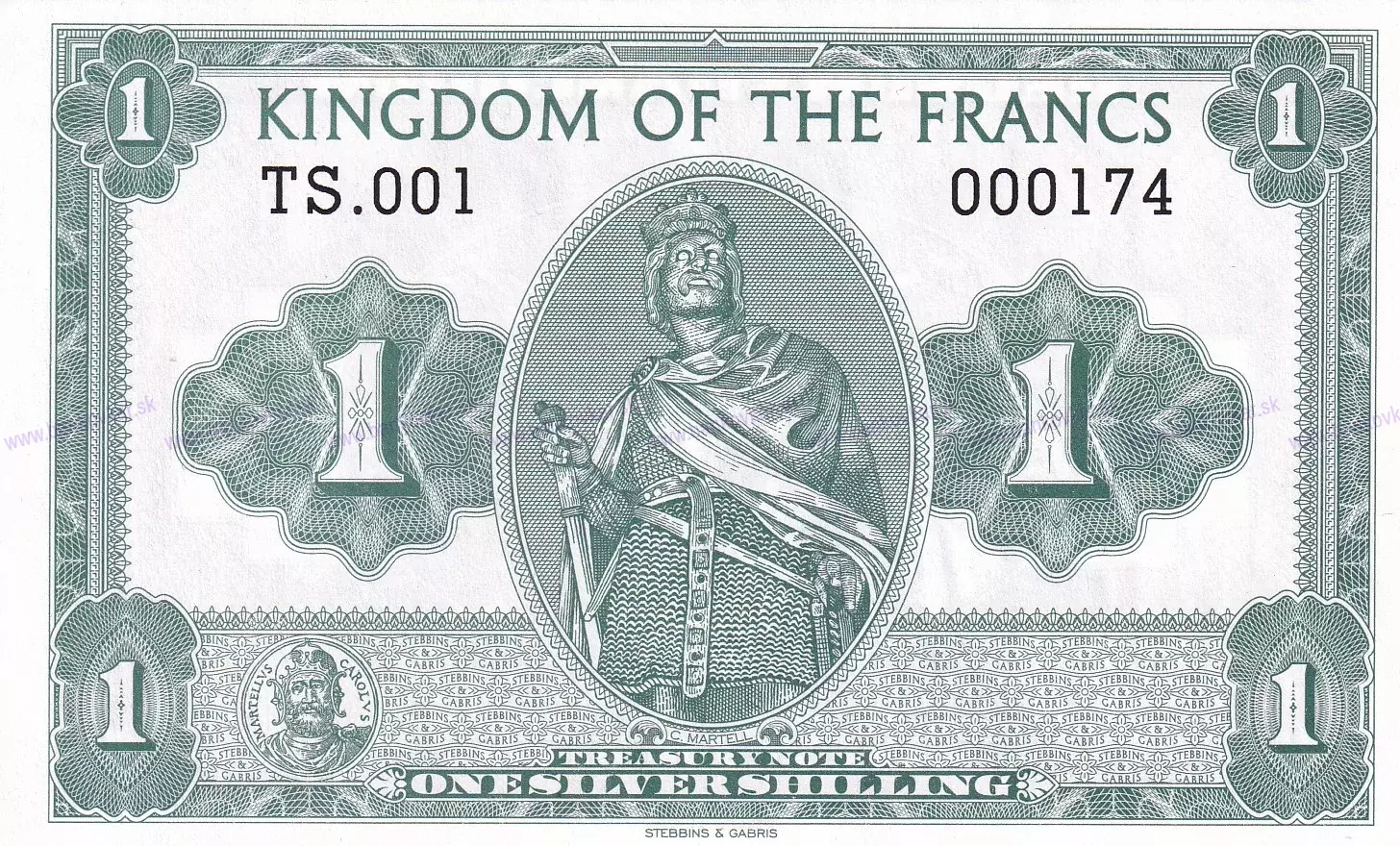 obrázok bankovky je iba ilustračný. -Vydaná: 2016 -Veľkosť: 126 x 77 mm -Zloženie: Vytlačené na papieri s vodoznakom a vláknami fluoreskujúcimi pod ultrafialovým svetlom a vytlačené "STEBBINS GABRIS" fluoreskujúce pod UV svetlom -Nominálna hodnota: 1 Silver Schilling -Predná strana: Kráľ Martellus Carol 5 -Zadná strana:Charles Martel bojuje proti Arabom v Poitiers -Vydaných: ? kusov -Popis: vodotlač, číslovanie