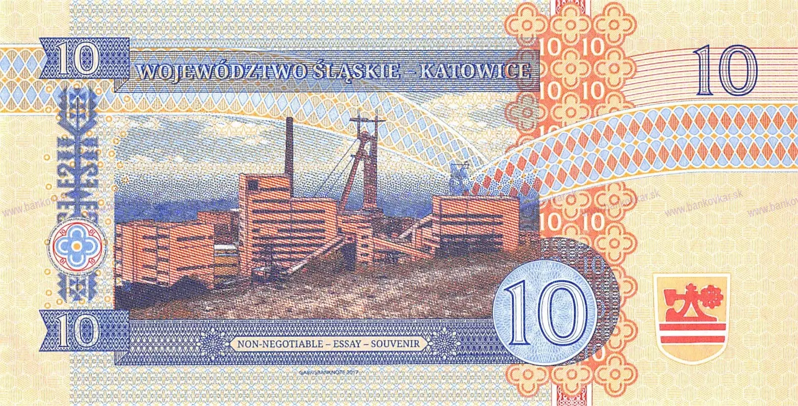 -Vydaná: 13.2.2017 -Veľkosť: 138 x 70 mm -Zloženie: Vytlačené na papieri s vodoznakom a vláknami fluoreskujúcimi pod ultrafialovým svetlom a vytlačené "Vzorka" fluoreskujúce pod UV svetlom -Nominálna hodnota: 10 Zlotych fantasy -Predná strana: The Spodek Arena Silesian Insurgents' Monument (Pomnik Powstancow Slaskich) Katowice -Zadná strana: Murcki coal mine is a large mine in the south of Poland in Katowice -Vydaných: 1100 kusov -Popis: číslovanie s jedinečnými individuálnymi číslami, vodotlač HATCHED OVAL