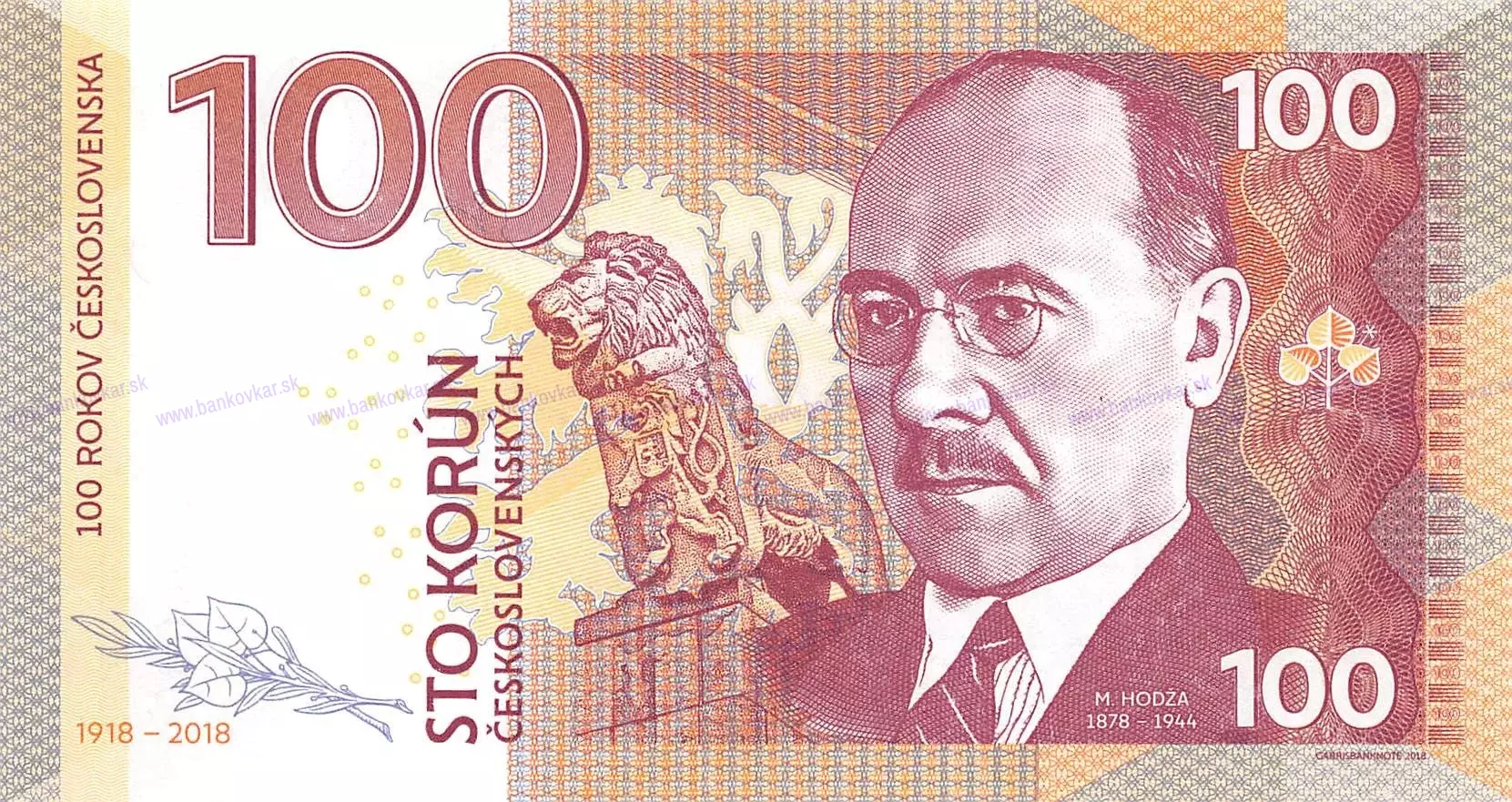 Československá výročná tlač, Autor: Matej Gábriš Vydaná dňa: 22-10-2018 Veľkosť: 140 x 76 mm Zloženie: tlačená na bankový papier s vodotlačou a obsahuje ochranné prvky, UV Fluorescenčné vlákna, UV pečať, Mikrotlač, Kvalitná ofsetová tlač. Nominálna hodnota: 100 Korun - Fantasy (hodnota NO) Vydaných: 988 kusov Popis: číslovanie: s jedinečnými individuálnymi číslami
