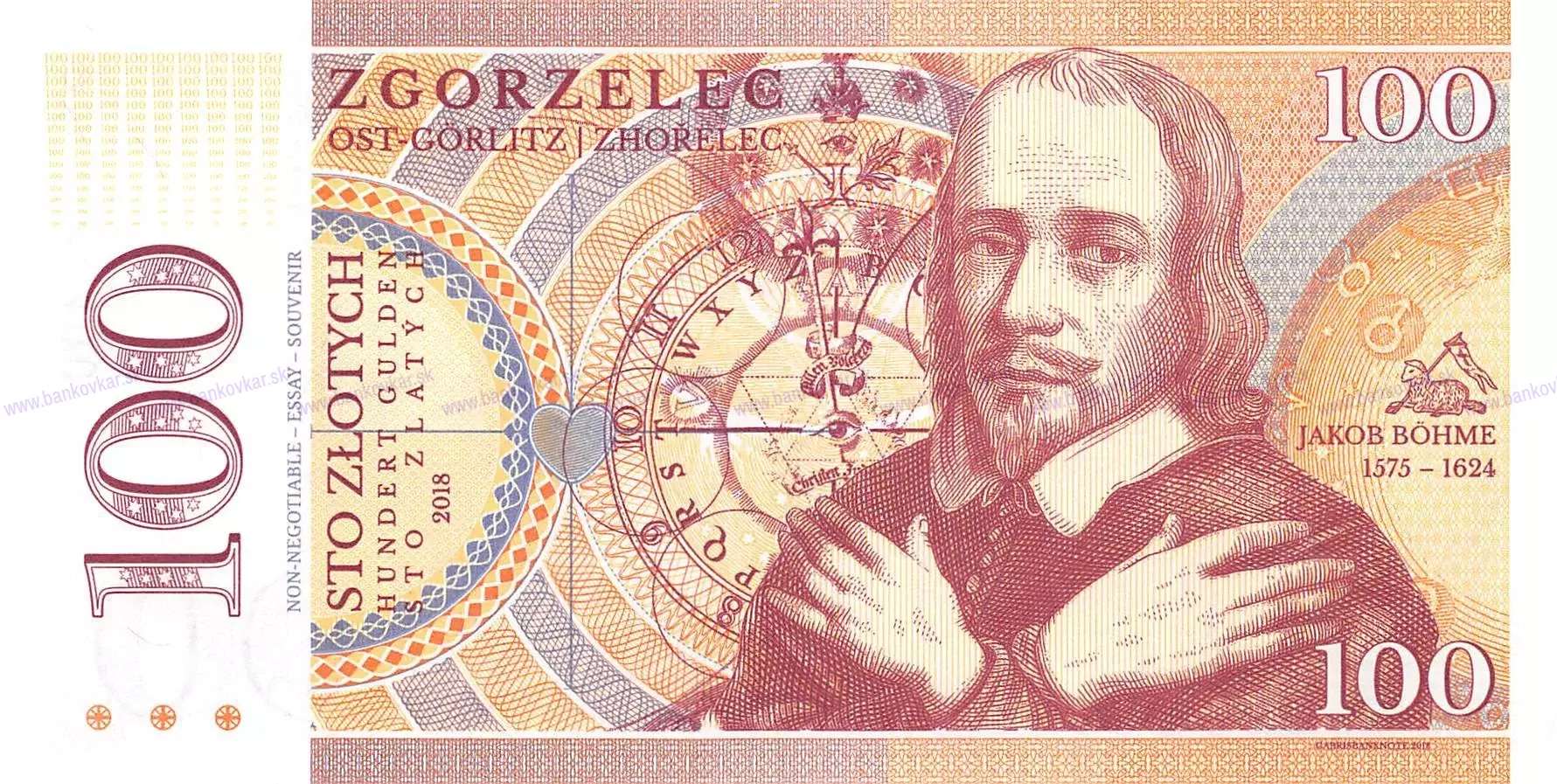-Predná strana: Jakob Böhme (*1575 ÷ †17.11.1624) bol nemecký filozof, vyučený obuvník, jedna z ústredných postáv kresťanskej mystiky a teozofie. Hegel ho nazval „prvým nemeckým filozofom“.