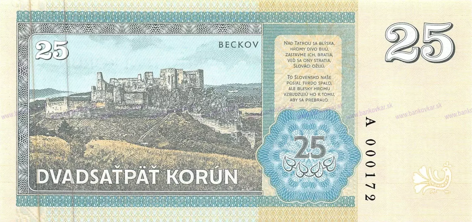 -Vydaná: 13.12.2018 -Veľkosť: 146 x 70 mm -Zloženie: Vytlačené na papieri s vodoznakom a vláknami fluoreskujúcimi pod ultrafialovým svetlom a vytlačené "Vzorka" fluoreskujúce pod UV svetlom -Nominálna hodnota: 25 korun fantasy -Predná strana: Jozef Miloslav Hurban (1817 - 1888) bol lídrom Slovenskej národnej rady a Slovenského povstania v rokoch 1848/1849, slovenského spisovateľa, novinára, politika, organizátora slovenského kultúrneho života a protestantského kňaza. -Zadná strana: Hrad Beckov je zrúcanina hradu neďaleko obce Beckov v okrese Nové Mesto nad Váhom, Trenčiansky kraj, západné Slovensko. -Vydaných: 700 kusov -Popis: číslovanie s jedinečnými individuálnymi číslami, série A a Z