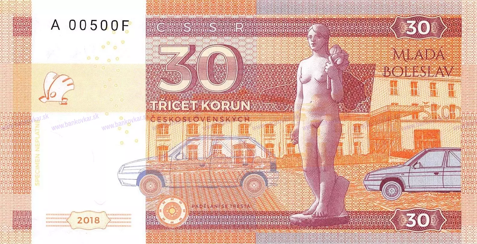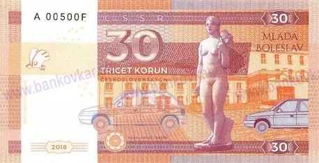 *Československá výročná bankovka 30 rokov od zahájenia výroby auta Škoda Favorit - Mladá Boleslav *Autor: Matej Gábriš *Vydaná dňa: 22-10-2018 *Veľkosť: 150 x 78 mm *Zloženie: tlačená na bankový papier s vodotlačou a obsahuje ochranné prvky, UV Fluorescenčné vlákna, UV pečať, Mikrotlač, Kvalitná ofsetová tlač. *Nominálna hodnota: 30 Korun - Fantasy *Vydaných: 1003 kusov *Popis: číslovanie: s jedinečnými individuálnymi číslami