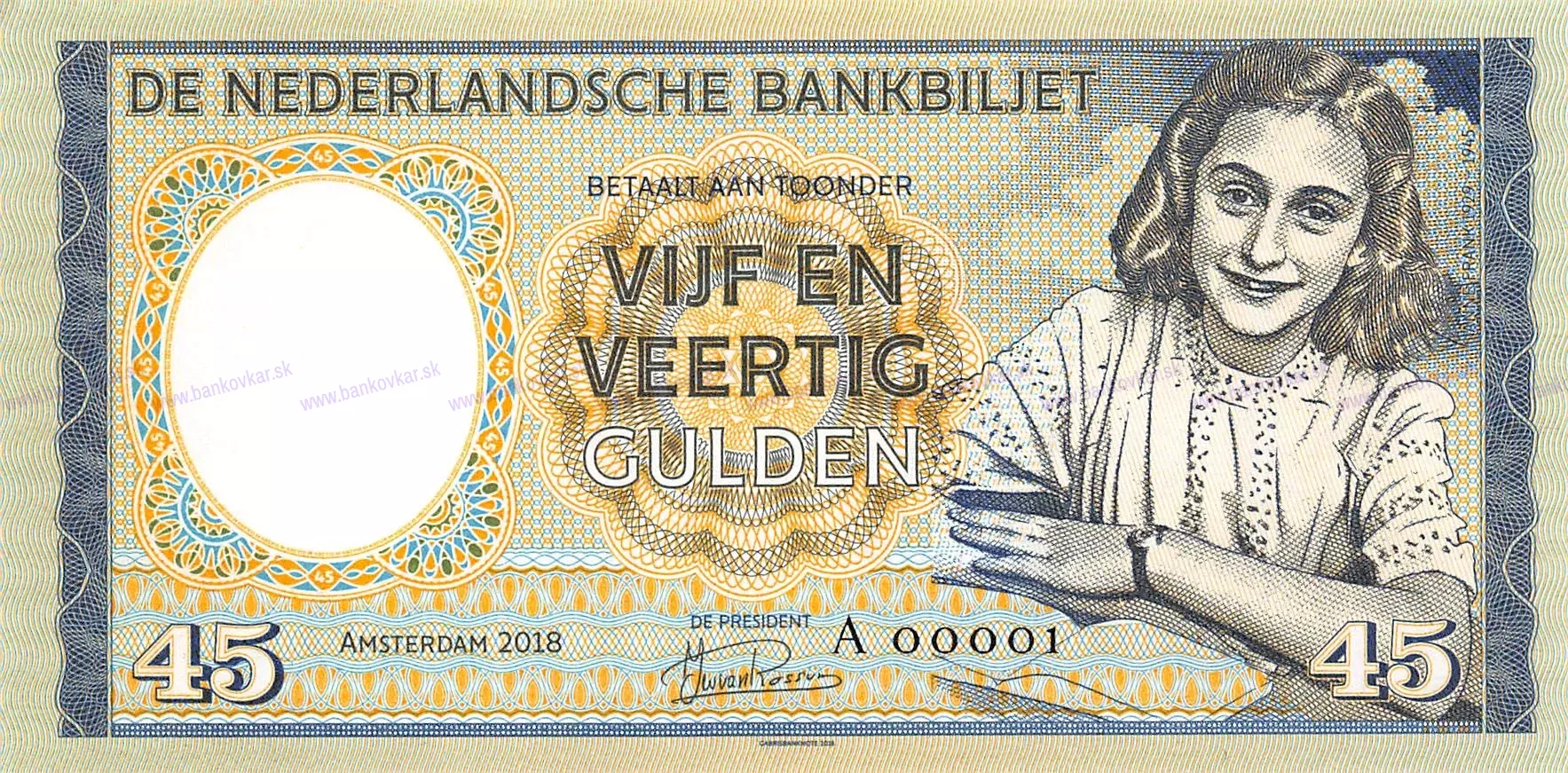 -Vydaná : 6.8.2018 -Veľkosť: 150 x 75 mm -Zloženie: tlačená na bankový papier s vodotlačou a obsahuje ochranné prvky, papier s kontinuálnym vodoznakom - oválna technika tlače: ofset (bodové farby),UV pečať -Nominálna hodnota: 45 Gulden fantasy -Predná strana: Anne Frank 1928-1945 dievča, ktoré sa stalo známym podľa denníka, ktorý napísala počas druhej svetovej vojny, keď sa schovávala v Amsterdame. -Zadná strana: Dom na Prinsengrachte, kde sa Anne Frank schovala a napísala svoj denník počas 2. svetovej vojny -Vydaných: 1000 kusov -Popis: číslovanie s jedinečnými individuálnymi číslami