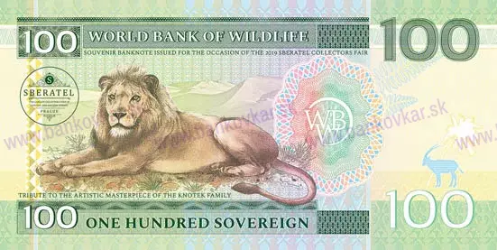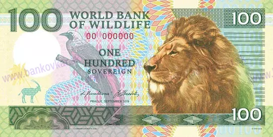 Vydaná: 6.9.2019 Praha Veľkosť: 152 x 77 mm Zloženie: Papier so spojitým vodoznakom - kontinuálne ovály. Vytlačené na papieri s vodoznakom a vláknami fluoreskujúcimi pod ultrafialovým svetlom, obsahuje 18 ochranných prvkov a bola vytlačená v tlačiarni cenín. Obsahuje vodoznak, vlákna a množstvo tlačových ochranných prvkov (giloše, rastry, mikropísmo, IRIS, UV farbu,atď.) Nominálna hodnota: 100 Sovereign fantasy (World bank of Wildlife) Predná strana: Lev a exotický vták - autormi grafických predlôh sú manželia Libuša a Jaromír Knotkovi Zadná strana: logo Sběratel, lev Vydaných: séria 01 - 400 ks, séria 02-1.200 ks, séria 03-1.600 ks Popis: číslovanie s jedinečnými individuálnymi číslami