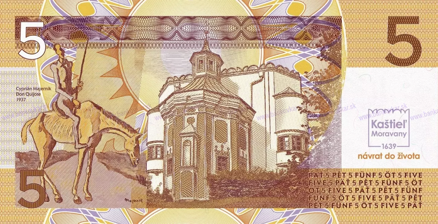 -Vydaná: 2019 -Veľkosť: 136 x 69 mm -Zloženie: Papier so spojitým vodoznakom - kontinuálne ovály. Vytlačené na papieri s vodoznakom a vláknami fluoreskujúcimi pod ultrafialovým svetlom -Nominálna hodnota: 5 korún umeleckých -Predná strana: Cyprian Majerník 1909-1945 - Jazdec na morskom brehu -Zadná strana: Kaštiel v Moravanoch nad Váhom 1639 - Majerník (Don Quijote 1937) -Vydaných: -Popis: číslovanie s jedinečnými individuálnymi číslami