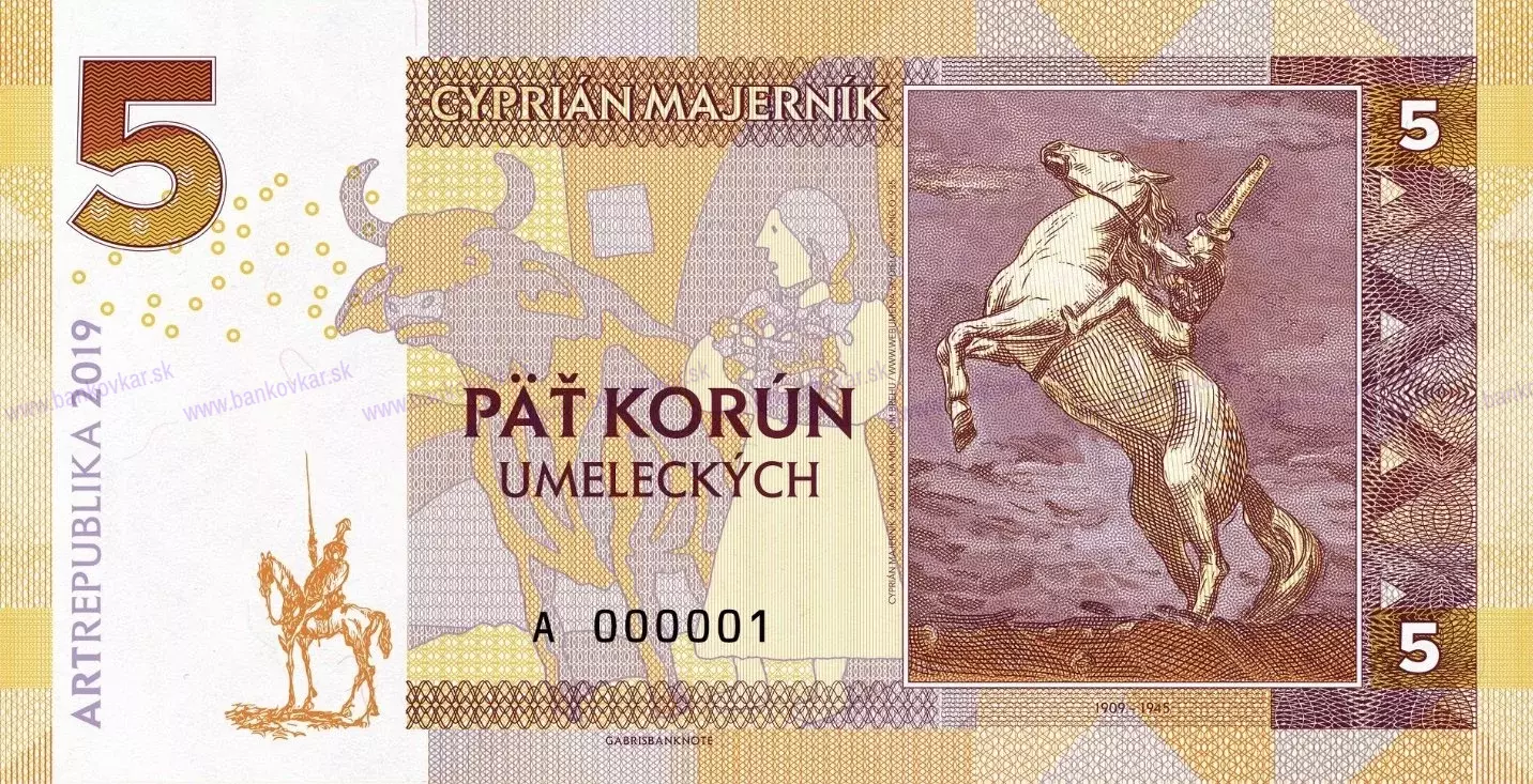 -Vydaná: 2019 -Veľkosť: 136 x 69 mm -Zloženie: Papier so spojitým vodoznakom - kontinuálne ovály. Vytlačené na papieri s vodoznakom a vláknami fluoreskujúcimi pod ultrafialovým svetlom -Nominálna hodnota: 5 korún umeleckých -Predná strana: Cyprian Majerník 1909-1945 - Jazdec na morskom brehu -Zadná strana: Kaštiel v Moravanoch nad Váhom 1639 - Majerník (Don Quijote 1937) -Vydaných: -Popis: číslovanie s jedinečnými individuálnymi číslami