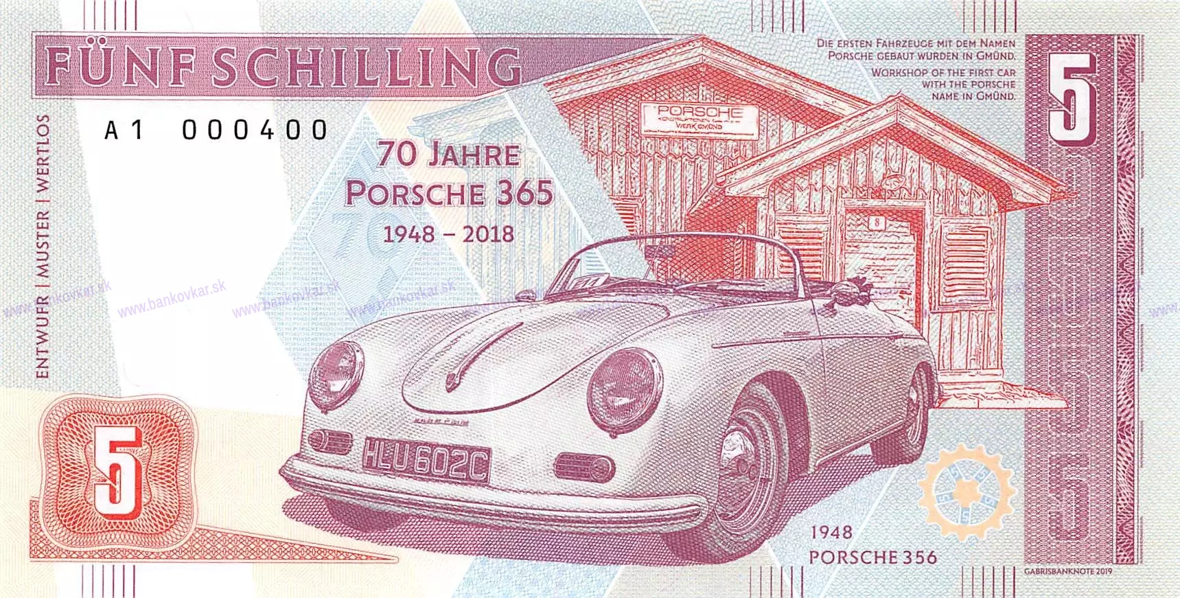 -Vydaná: apríl 2019 -Veľkosť: 145 x 77 mm -Zloženie: Vytlačené na papieri s vodoznakom a vláknami fluoreskujúcimi pod ultrafialovým svetlom a vytlačené "Vzorka" fluoreskujúce pod UV svetlom -Nominálna hodnota: 5 korun fantasy -Predná strana: Ferdinand Porsche 1875÷1951, rodný dom vo Vratislaviciach nad Nisou (dnes súčasť Liberca), Česko -Zadná strana: Porsche 356 (tlačová chyba "70 JAHRE PORSCHE 365") , prvý obchod značky PORSCHE v GMÜND-e, s prvým autom Porsche 356 -Vydaných: 1.000 kusov; 200 ks ANULÁT; 500 ks prítlač AUTOCULTURA -Popis: číslovanie s jedinečnými individuálnymi číslami