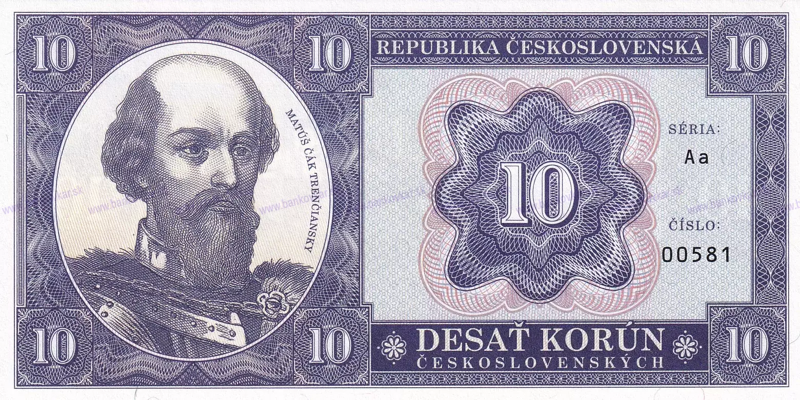 obrázok bankovky je iba ilustračný. Autor: Matej Gábriš -Vydaná: 15.2.2020 -Veľkosť: 135 x 68 mm -Zloženie: Vytlačené na papieri s vodoznakom a vláknami fluoreskujúcimi pod ultrafialovým svetlom. -Nominálna hodnota: 10 Korún čsl. fantasy -Predná strana:Matúš Čák Trenčiansky (1260 ÷ † 18.3.1321) bol uhorský šľachtic a vojvodca. V súdobých reáliách bol najmocnejším vládcom celého terajšieho západného a stredného Slovenska. Prezývali ho aj pán Váhu a Tatier. -Zadná strana: Trenčiansky hrad -Popis: série Aa = 1000 ks, G = 300 ks, Anulát = 100 ks,vodotlač a číslovanie