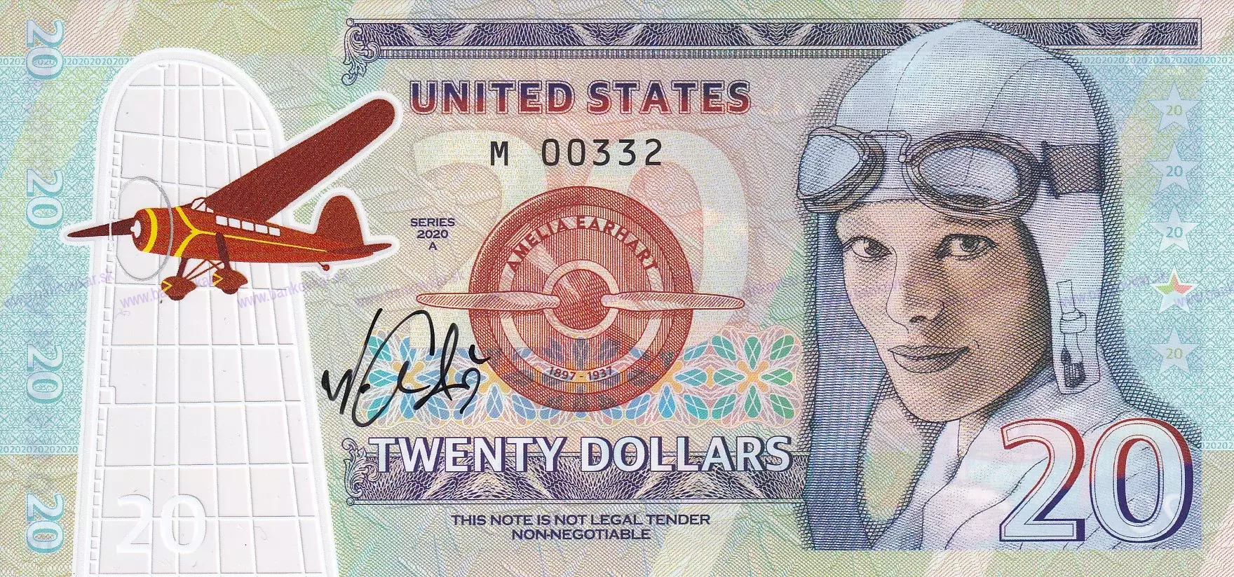 | Predná strana: | Amelia Mary Earhartová (* 24. júl 1897, Atchison – nezvestná od 2. júla 1937, pravdepodobne na atole Nikumaroro) bola americká pilotka, ktorá ako prvá žena v roku 1928 preletela Atlantický oceán. Pri pokuse uskutočniť let okolo sveta v roku 1937 záhadne zmizla počas letu nad Tichým oceánom. | |||