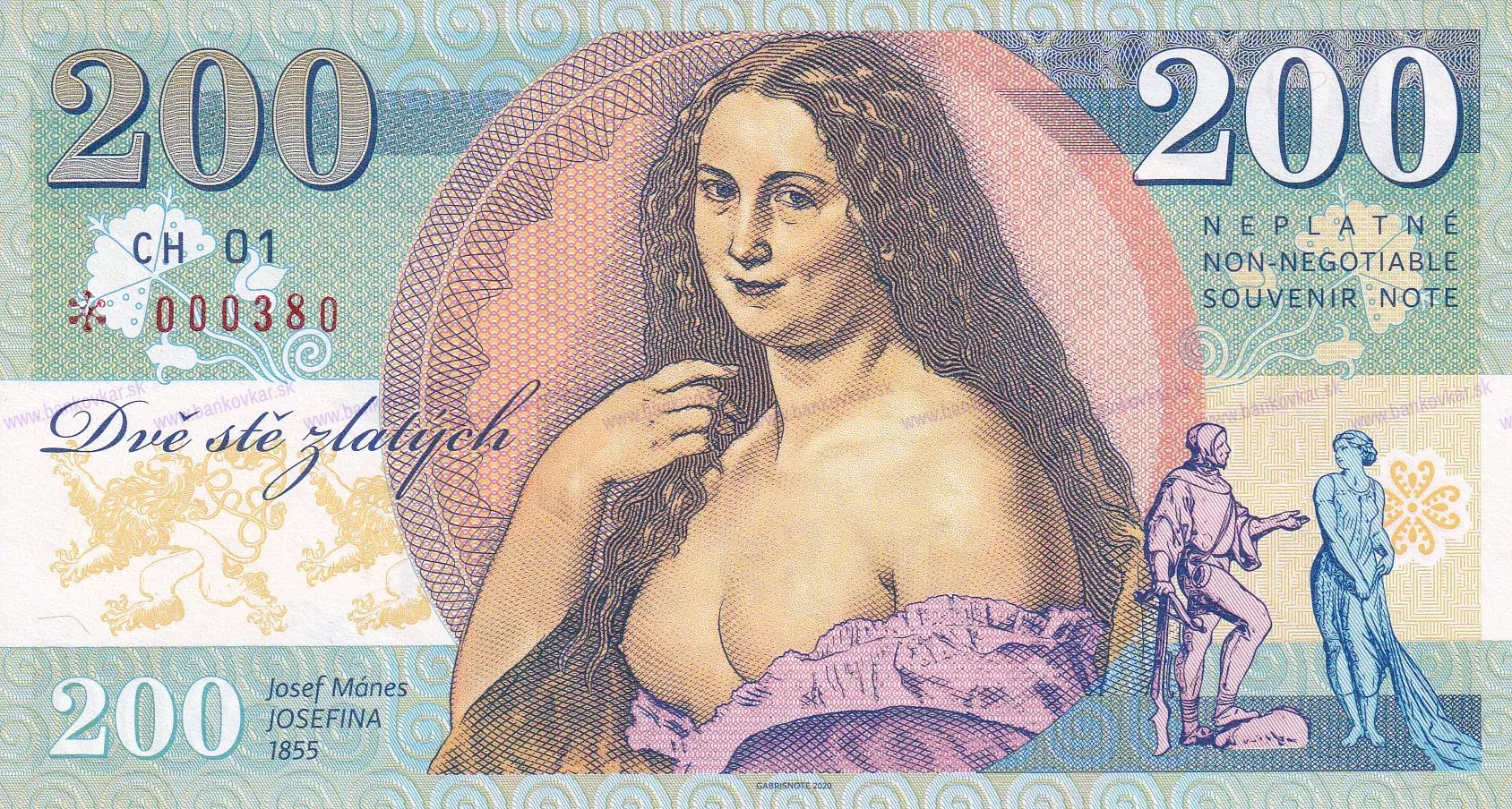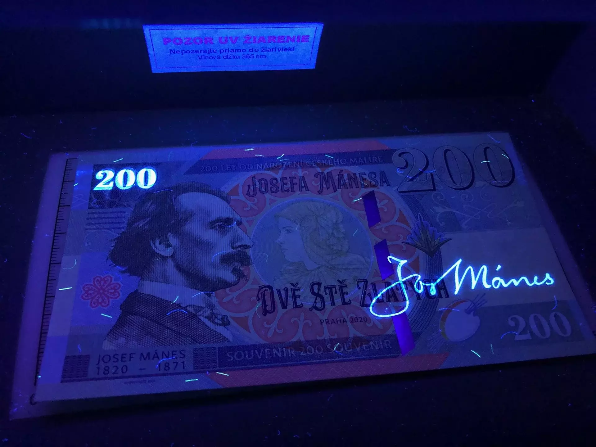 Zloženie: Vytlačené na papieri s vodoznakom a vláknami fluoreskujúcimi pod ultrafialovým svetlom + UV reaguje hodnota 200 a autogram J. Mánesa