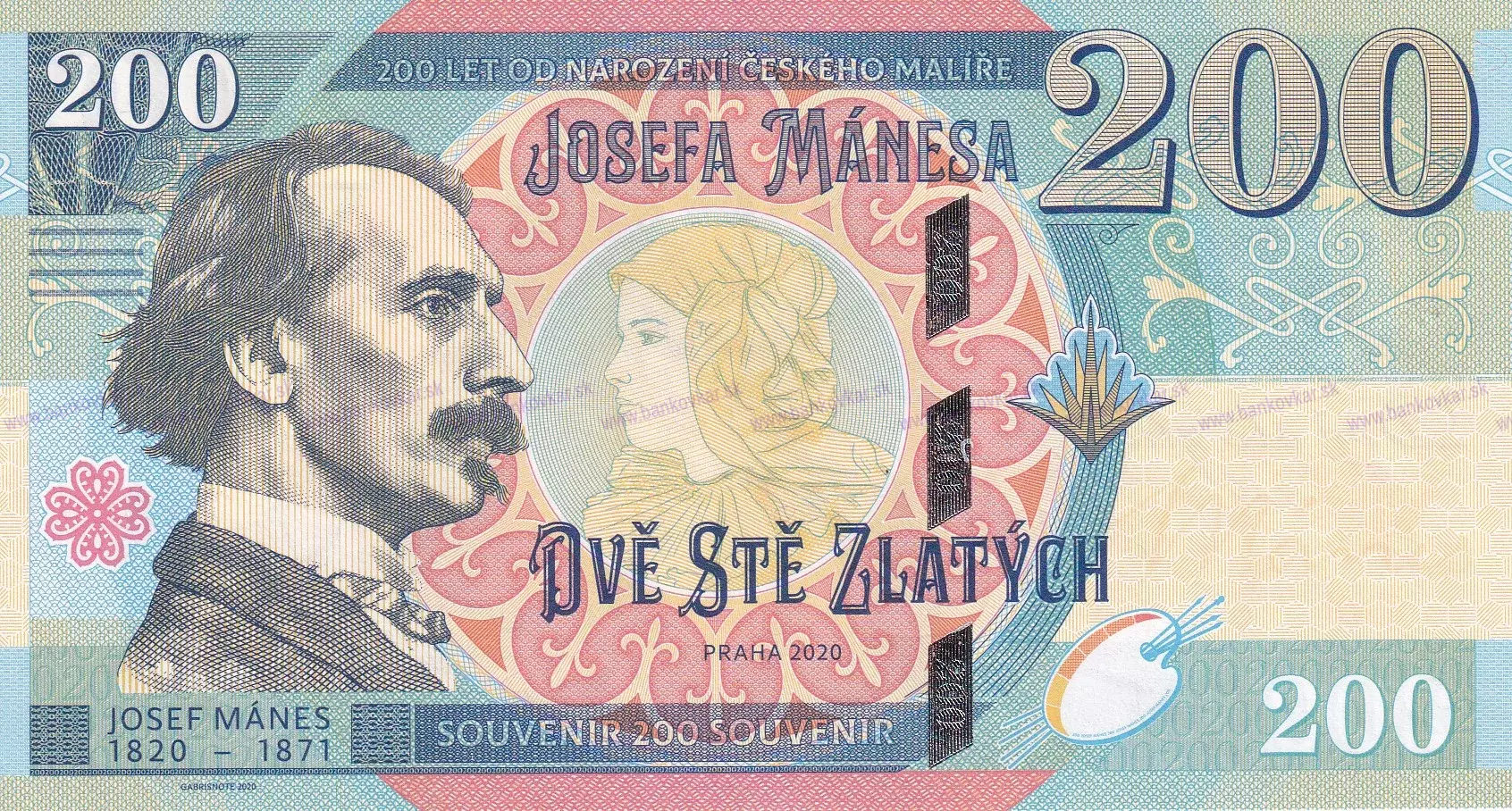 Predná strana: Josef Mánes - český maliar a ilustrátor, významný predstaviteľ romantizmu.Je považovaný za zakladajúcu osobnosť českého výtvarníctva a najväčšieho majstra českej maľby a krajinárstva. Študoval na pražskej Akadémii, v Mníchove a v mladosti podnikol niekoľko študijných ciest, okrem iného do Drážďan, Poľska a Sliezska.