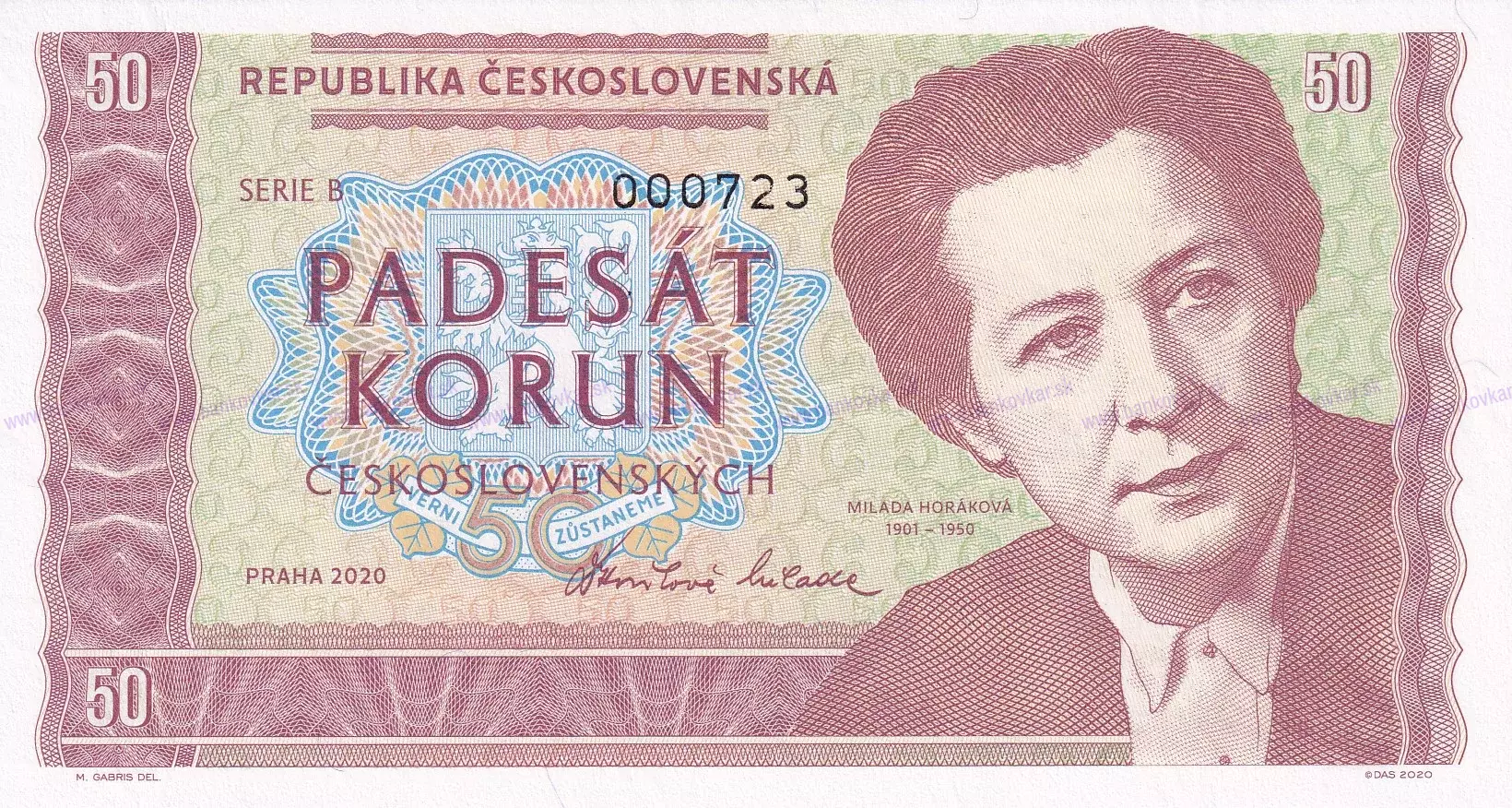 -Vydané: 2020 Praha -Veľkosť: 148 x 70 mm -Zloženie: Papier so spojitým vodoznakom - kontinuálne ovály. Vytlačené na papieri s vodoznakom a vláknami fluoreskujúcimi pod ultrafialovým svetlom ,obsahuje 18 ochranných prvkov a bola vytlačená v tlačiarne cenin. Obsahuje vodoznak, vlákna a množstvo tlačových ochranných prvkov (giloše, rastry, mikropísmo, IRIS, UV farbu,atď.) -Nominálna hodnota: 50 korún fantasy -Predná strana: Milada Horáková (1901-1950) bola českáprávnička a politička a obeť justičnej vraždy pri komunistických politických procesoch v 50. rokoch minulého storočia. Vo vykonštruovanom procese bola odsúdená za vlastizradu. 27. júna 1950, na príkaz prezidenta Gottwalda, bola Horáková na dvore pankráckej väznice obesená. Bola jedinou popravenou ženou v rámci týchto procesov a vďaka svojej neústupnosti sa stala symbolom odporu proti vládnucej komunistickej strane. -Zadná strana: Veznica na Pankráci -Svoboda je svoboda, bez té nelze žít,tu nám nikdo neprodá,pro tu musíme se bít. -Vydaných:Séria A - 400 kusov, Séria B-1600 kusov -špeciálne čísla 000001-000100 boli ponechané pre tzv. párové sady. Popis: číslovanie s jedinečnými individuálnymi číslami