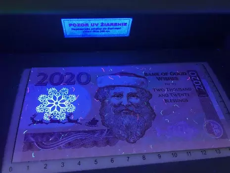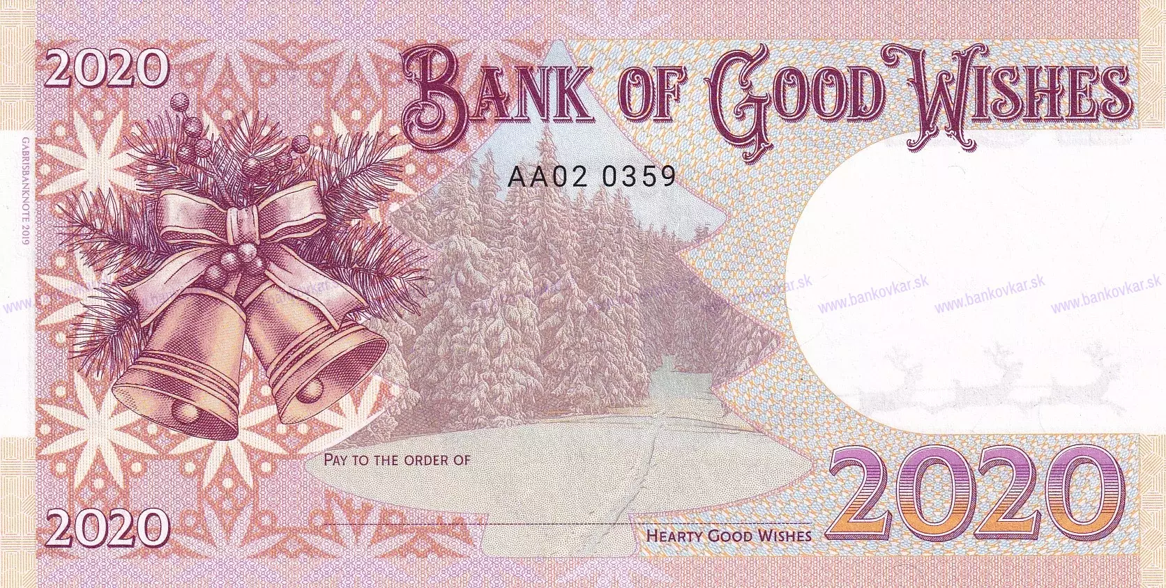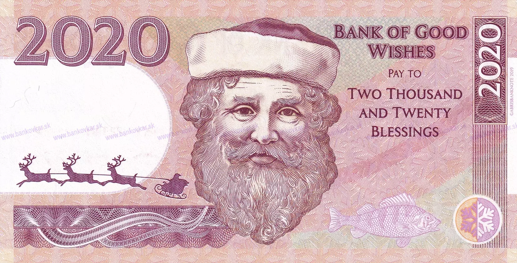 -Vydaná: 1/2020 -Veľkosť: 143 x 74 mm -Zloženie: Vytlačené na papieri s vodoznakom TROJUHOLNÍKY a vláknami fluoreskujúcimi pod ultrafialovým svetlom a vytlačená "SNEHOVÁ VLOČKA" fluoreskujúce pod UV svetlom -Nominálna hodnota: 2020 fantasy -Predná strana: Soby,sane a Santa Klaus -Zadná strana: Zvončeky a Ihličnaté stromy -Vydaných: séria AA 01/500 ks, AA 02/ 400 ks, MG 01/ 50 ks, PF 2020/ 200 ks, PF 2020 indiv. číslo/ 200 ks spolu 1350ks -Popis: číslovanie s jedinečnými individuálnymi číslami, séria AA02,?