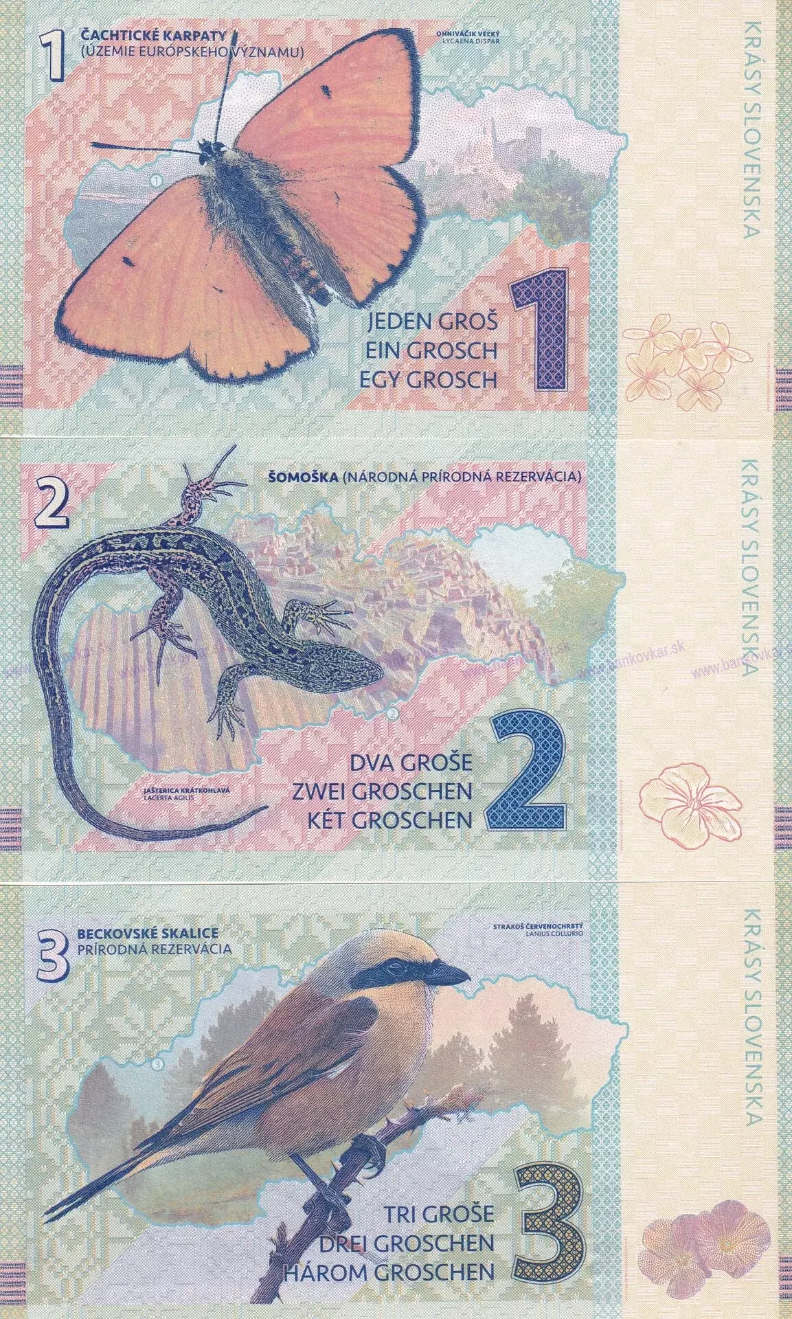 | Zadná strana 1 Groš: | Čachtické karpaty (územie európskeho významu), motýľ Ohniváčik veľký, kvet mesačnica trvácna | |||