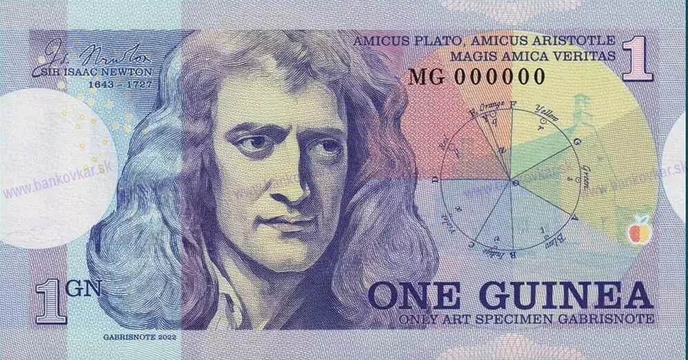 | Predná strana: | Sir Isaac Newton , prezident Kráľovskej spoločnosti (* 4. január 1643, Woolsthorpe-by-Colsterworth, Anglicko – † 31. marec 1727, Kensington) bol anglický fyzik, matematik a filozof. | | | |