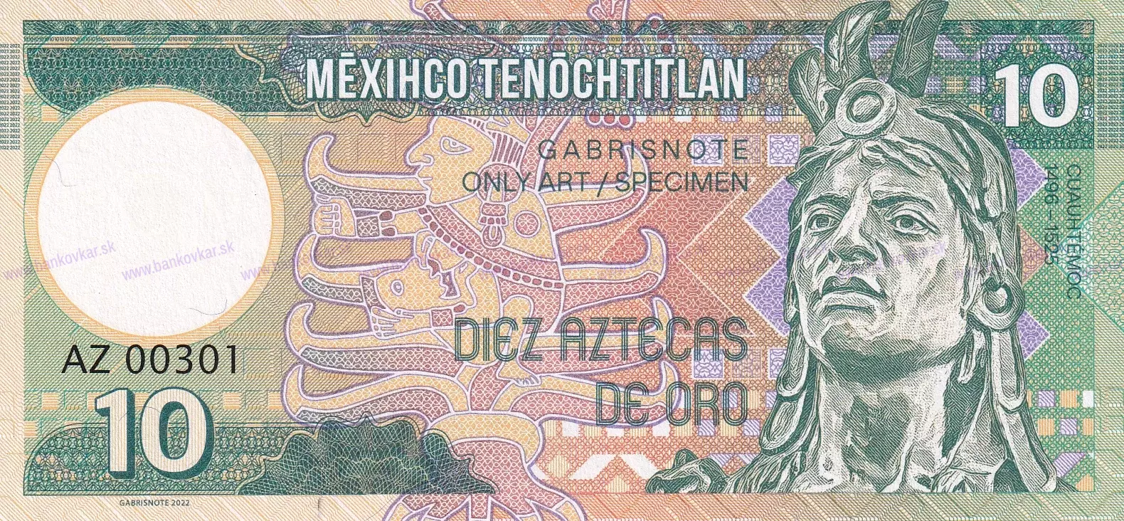 | Motív - téma: | Hlavné mesto aztéckej ríše Tenochtitlan, na mieste ktorého dnes stojí hlavné mesto Mexico. V dobe objavenia mesta Európanmi v 16. storočí malo stotisíc obyvateľov a bolo najväčším mestom amerického kontinentu. |