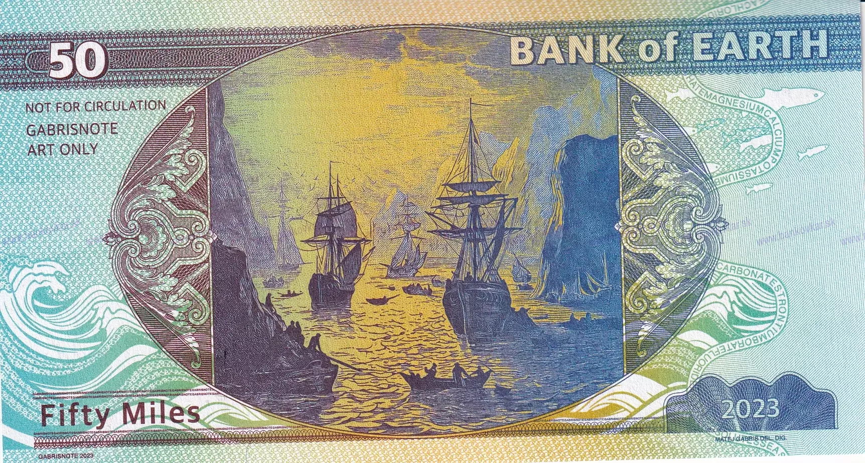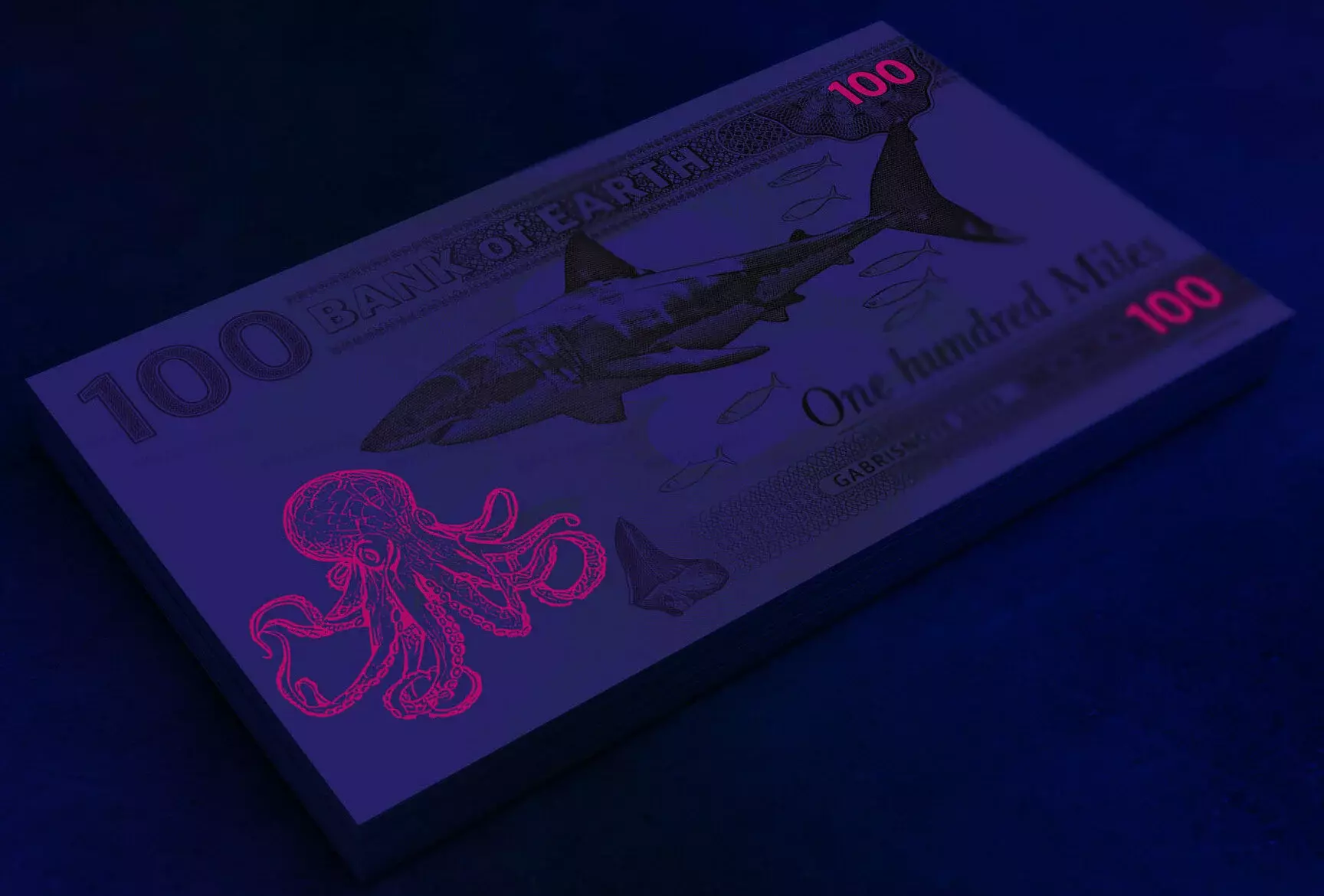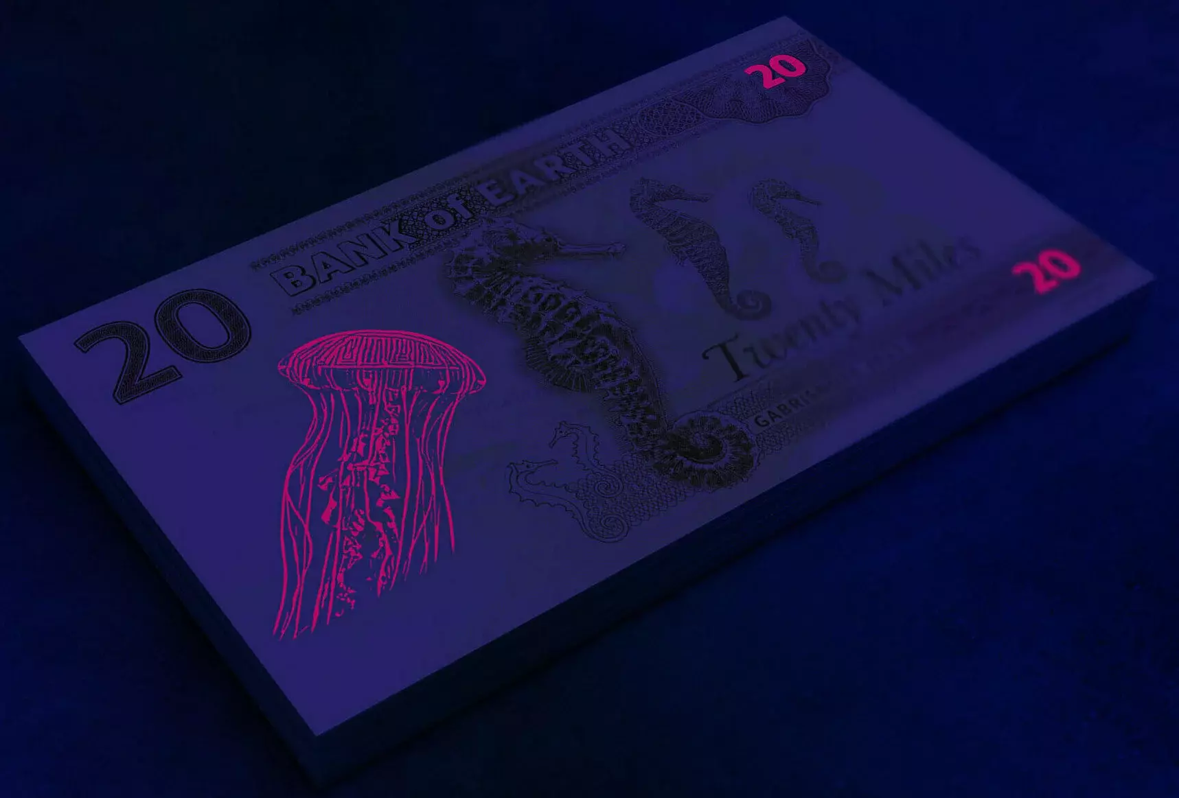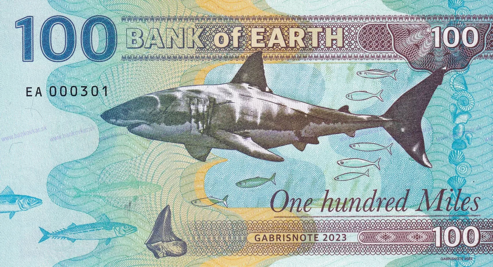 | Predná strana: | 20 Miles Koník morský, 50 Miles Bieluha žltobiela, 100 Miles Žralok modrý (tiež z ang. veľký biely žralok) |