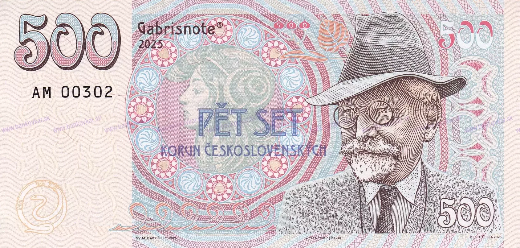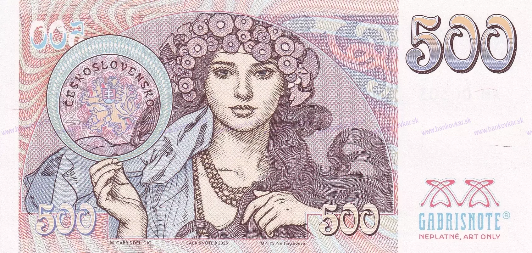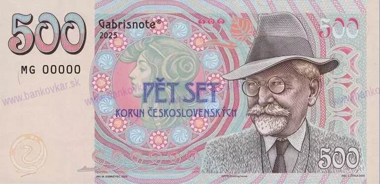 Predná strana:Jozef Česla nakreslil portrét českého maliara, grafika a návrhára Alfonza Muchu, najvýznamnejšej maliarskej osobnosti európskej secesie a jedna z určujúcich osobností českého maliarstva. Československé bankovky, ktoré vyšli z jeho návrhov patria medzi to najkrajšie v našich zbierkach. Rozhodol som sa Gábrišovku poňať ako voľné pokračovanie tisíckoruny s portrétom Bedřicha Smetanu, ktorá tiež vznikla v spolupráci s Jozefom Česlom.