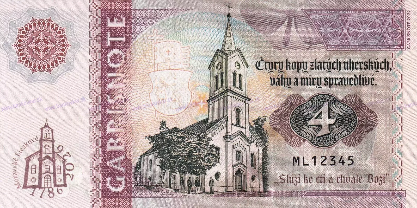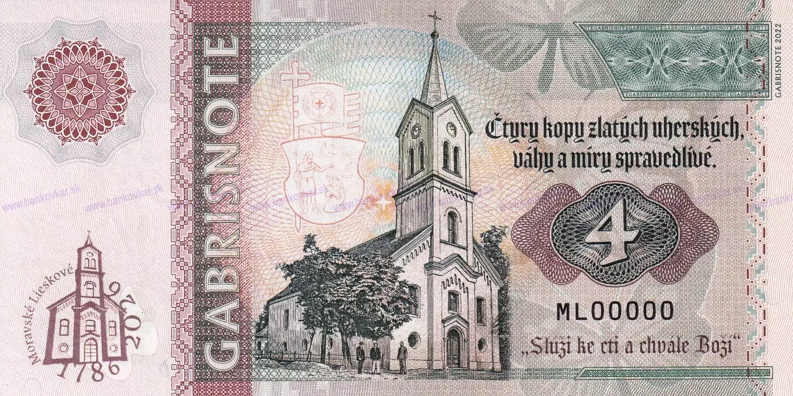 | Motív - téma: | Tématická nadväznosť na gábrišovku "100 Korún Martin Rázus 2024 / Moravské Lieskové" - privátna emisia pri príležitosti 240. výročia evanjel. kostola v Moravskom Lieskovom, ktorá bude slúžiť ako poďakovanie za podporu ... |