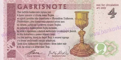 | Zadná strana: | Popis účelu vydania suveníru (biblickým švabachom); obradný kalich; giloše |