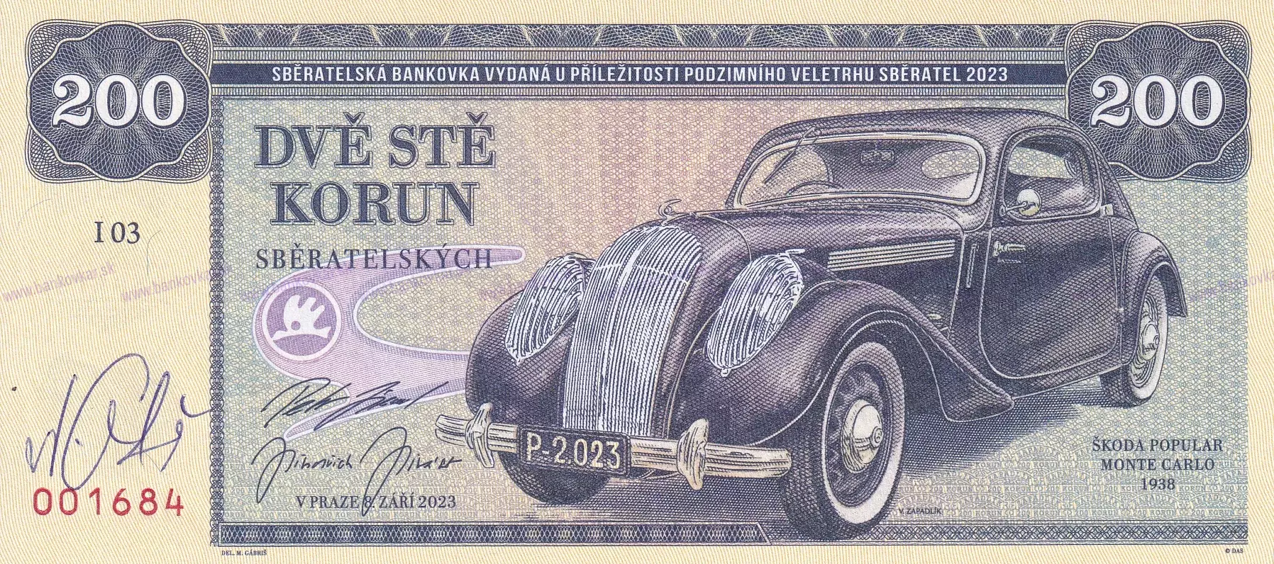 | Predná strana: | Škoda Popular Sport Monte Carlo (typ 909), vyrábaná v r. 1935÷1938, celkom vyrobených 72 ks v karosárskych úpravách Roadster, Roadster De Luxe a Coupé Sport |