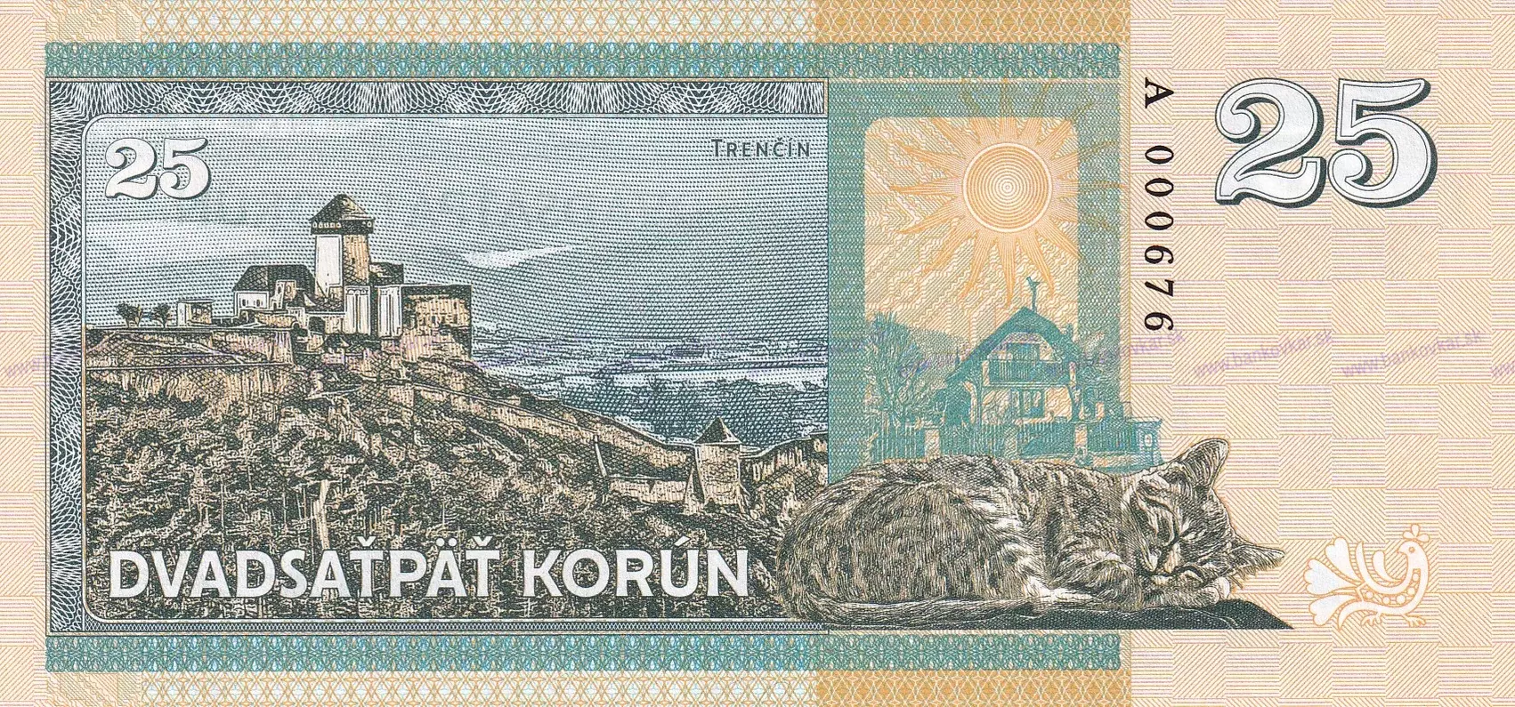 -Vydaná: 2017 -Veľkosť: 147 x 70 mm -Zloženie: Vytlačené na papieri s vodoznakom a vláknami fluoreskujúcimi pod ultrafialovým svetlom a vytlačené " fluoreskujúce pod UV svetlom -Nominálna hodnota: 25 korun fantasy -Predná strana: Ivana Sarah Pristachová -Zadná strana: Trenčianský hrad, spiaca mačka -Vydaných:700 ks séria A,45 ks séria Z, 25 ks anuláty -Popis: číslovanie s jedinečnými individuálnymi číslami, vodotlač pyramídy