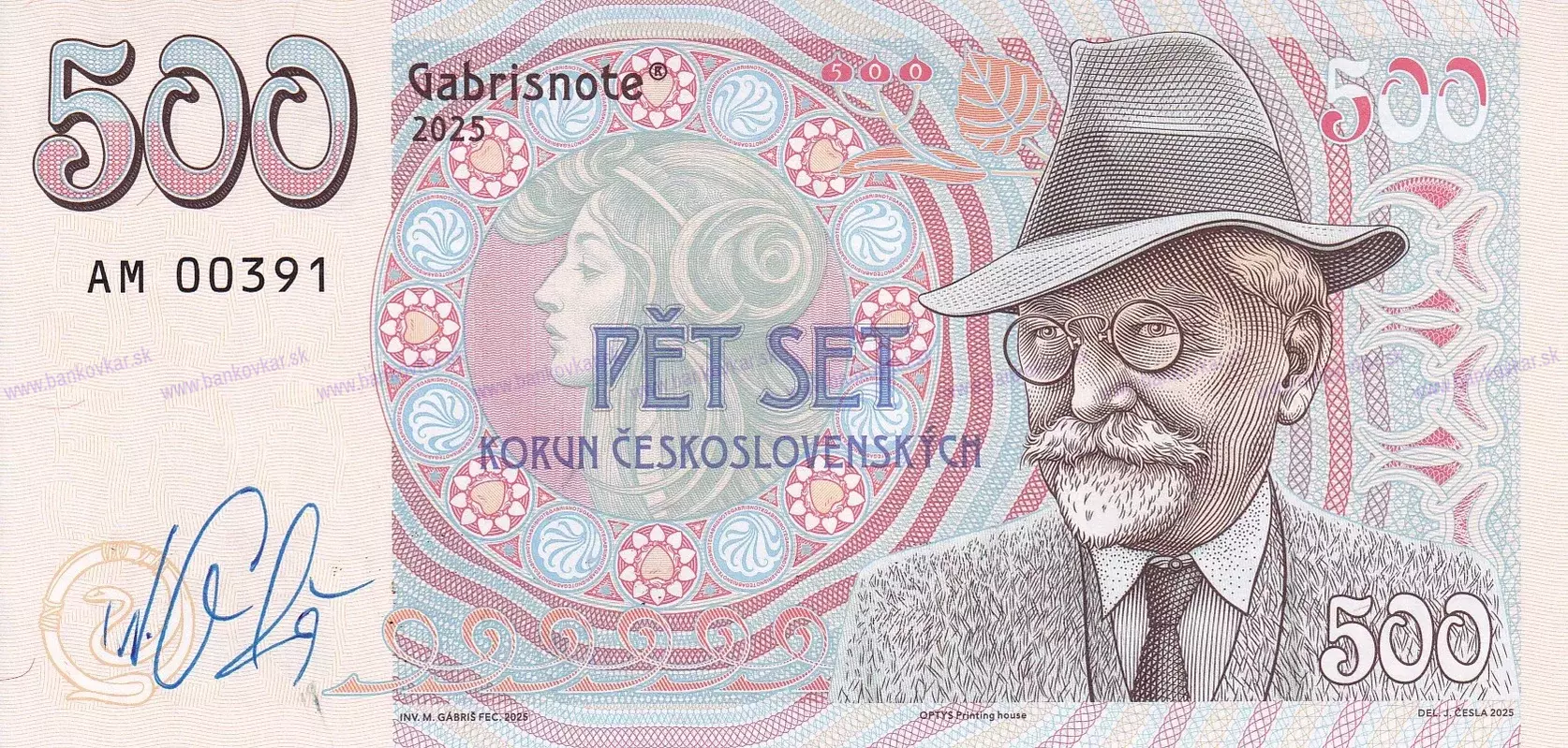 | Predná strana: | Jozef Česla je autorom portrétu českého maliara, grafika a návrhára Alfonza Muchu - najvýznamnejšej maliarskej osobnosti európskej secesie a jedna z určujúcich osobností českého maliarstva. Československé štátovky, ktoré vyšli z jeho návrhov patria medzi to najkrajšie v našich zbierkach. Táto gábrišovka je poňatá ako voľné pokračovanie tisíckorunáčky s portrétom Bedřicha Smetanu, ktorá tiež vznikla v spolupráci s Jozefom Česlom - vzniká týmto možná pekná a zaujímavá séria spoločnej tvorby a spolupráce 2 výrazných slovenských osobností. |