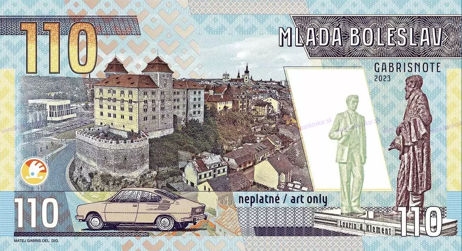 | Zadná strana: | Hrad Mladá Boleslav a pomník zakladateľov predchodcu fabriky Škoda - spol. Laurin & Klement - páni Václav Laurin a Václav Klement |