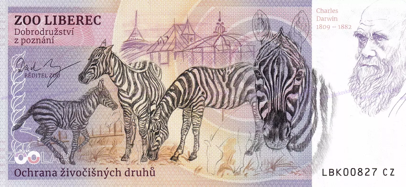 | Zadná strana: | Riaditeľ ZOO : MVDr. David Nejedlo / Zebra + hotel a TV vysielač Ještěd / Charles Darwin (1809÷1882) |