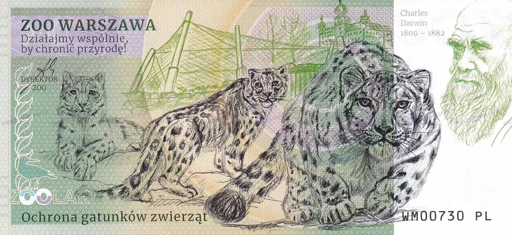 | Zadná strana: | Riaditeľ ZOO: Dr. Andrzej G. Kruszewicz / Leopard snežný (Irbis - Barys) / bežný var. (a): Charles Darwin (1809÷1882) ; výročný var. (b): Jan Żabiński (1897÷1974) ; výročný var. (c): Antonina Żabińska (1908÷1971) |