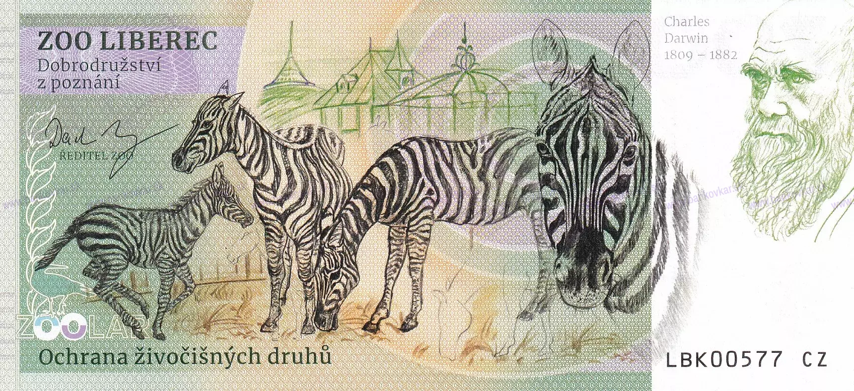 | Zadná strana: | Riaditeľ ZOO : MVDr. David Nejedlo / Zebra + hotel a TV vysielač Ještěd / Charles Darwin (1809÷1882) |
