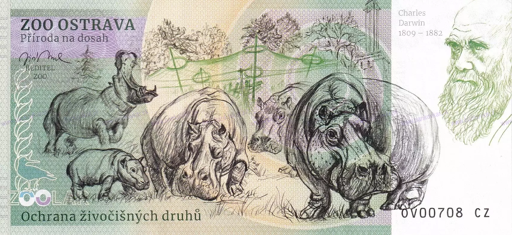| Zadná strana: | Riaditeľ ZOO: Jiří Novák / Hroch + vyhlídková věž Nové radnice Moravská Ostrava / Charles Darwin (1809÷1882) |