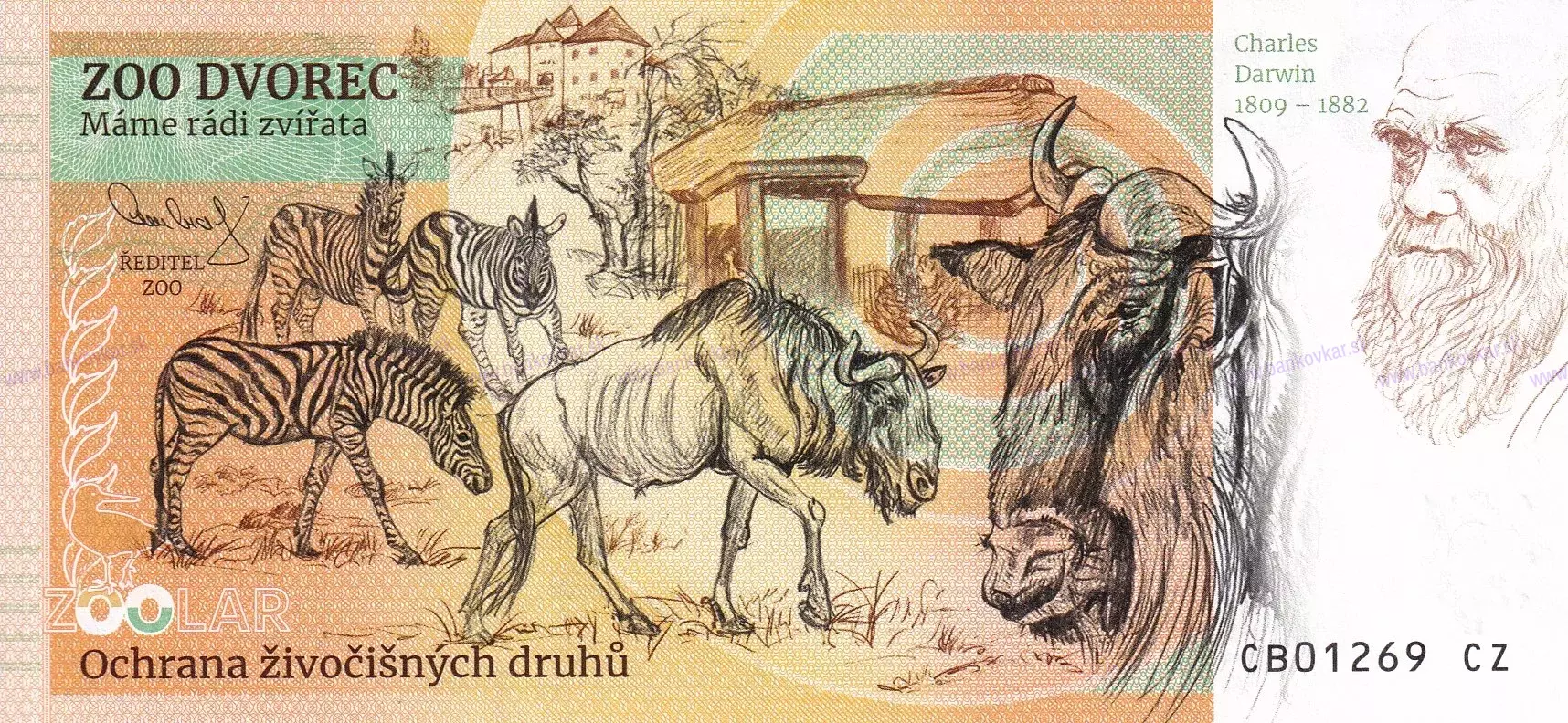 | Zadná strana: | Riaditeľ ZOO: Viktor Ambrož / Zebra Chapmanova + Pakůň žíhaný a tvrz Žumberk ? / Cuknštejn ? / Charles Darwin (1809÷1882) |