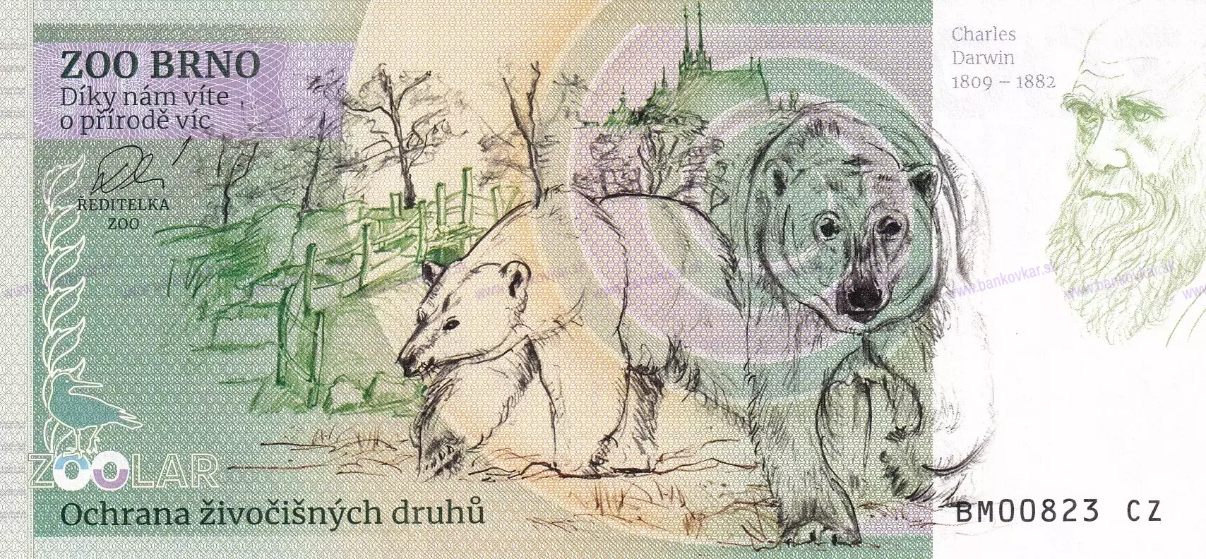 | Zadná strana: | Riaditeľka ZOO: Mgr. Radana Dungelová / Medveď ľadový + Katedrála sv. Petra a Pavla na Petrově / Charles Darwin (1809÷1882) |