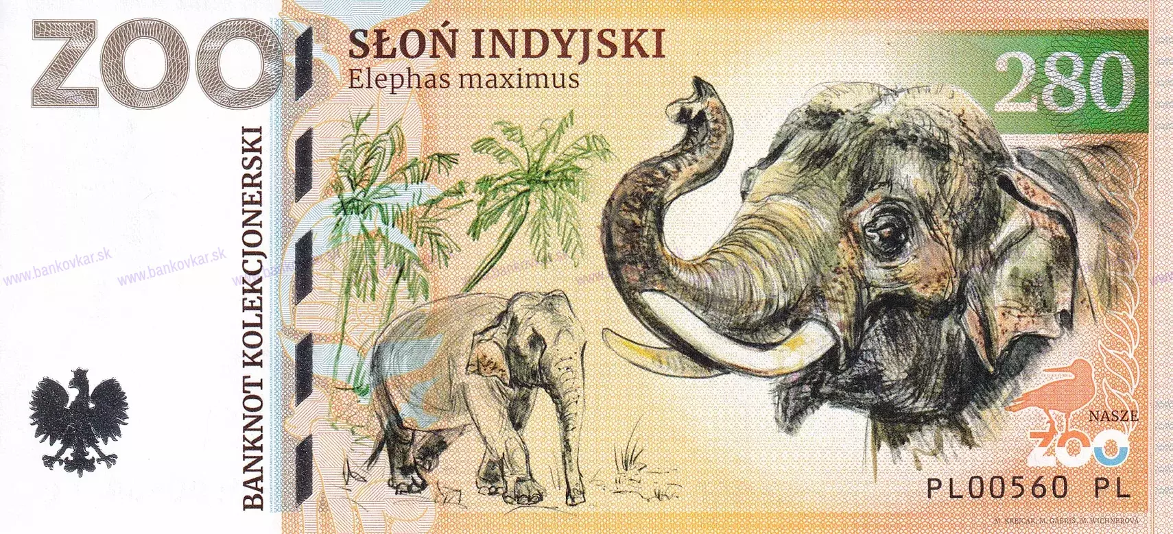 | Nominálna hodnota: | 280 - Słoń indyjski (Elephas maximus / SK: Slon ázijský indický / CZ: Slon indický) |