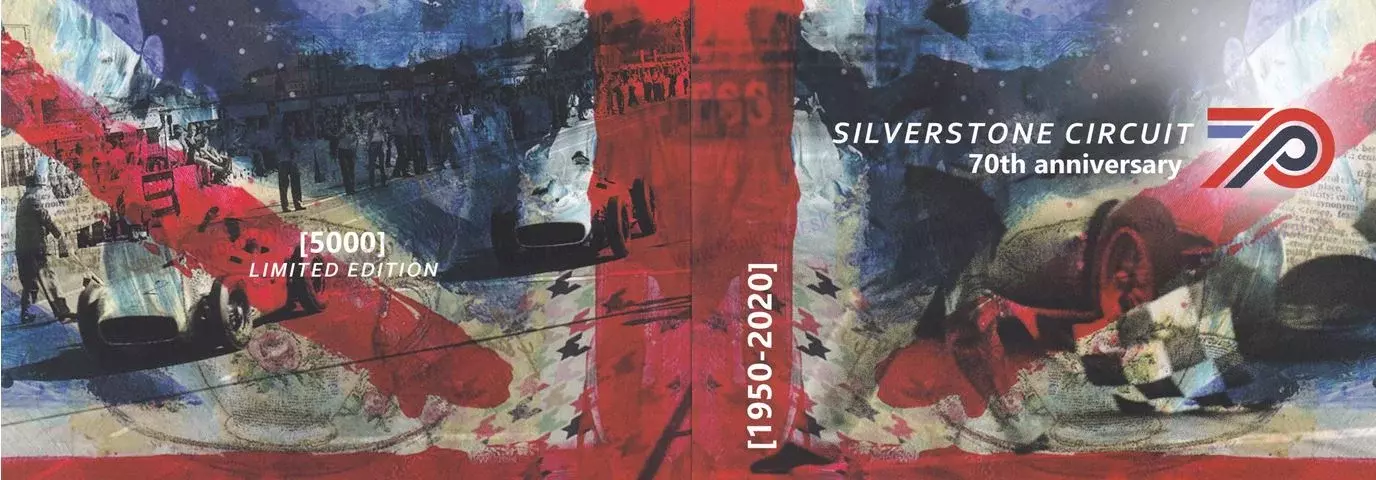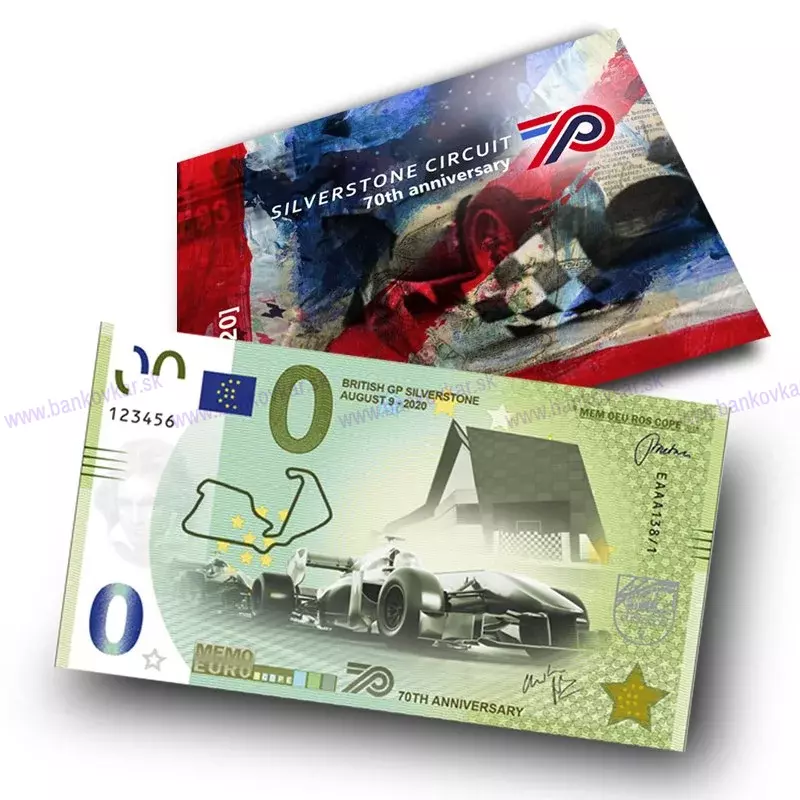 Táto 0 Euro suvenír pripomína konanie 70. výročia Veľkej ceny Veľkej Británie,okruh Silverstone a históriu F1.
