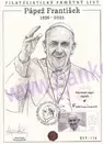 Príležitostný autorský kašet Adriana Ferdu - "* Pápež František 1936-2025 * 266.rímsky biskup*" vytvorený pri príležitosti úmrtia pápeža na príležitostný pamätný list s autorskou grafikou, slovenskou známkou 748/2021 a autorským kašetom