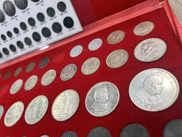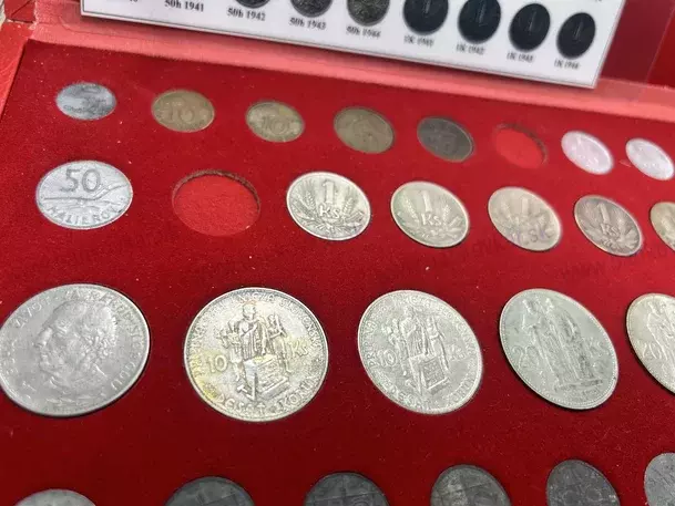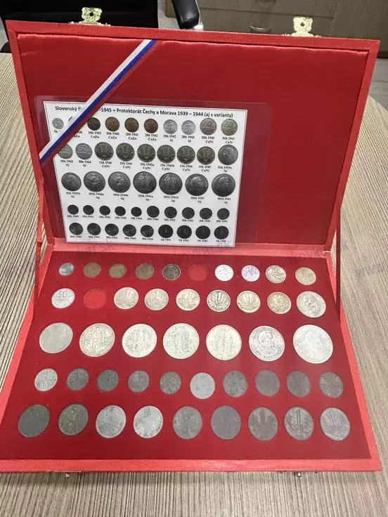 V kazete sa nachadzajú všetky obehové mince aj varianty SŠ okrem 2ks - 20h 1942 a 50h 1944 + všetky obehové mince protektorátu Čiech a moravy , spolu je 43ks mincí.