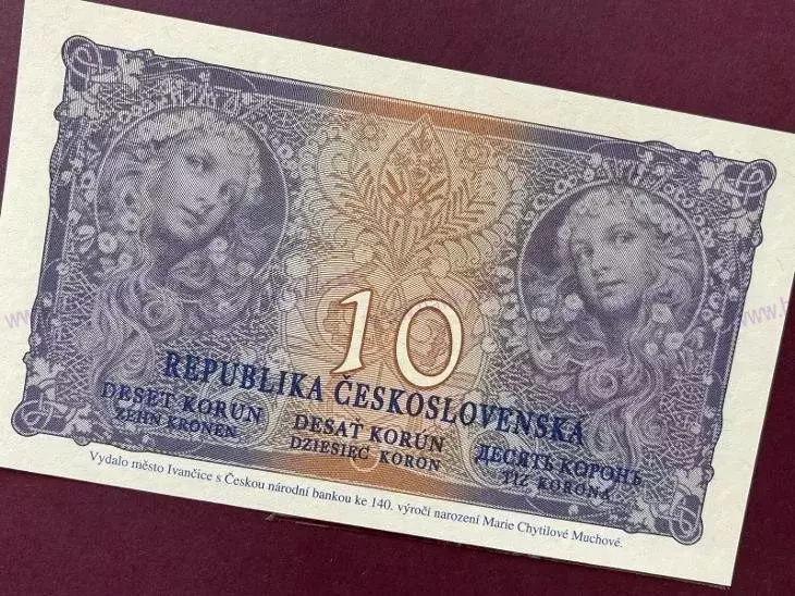 Oproti historickému návrhu štátovky má ten súčasný predsa len niečo naviac. Špeciálnou UV farbou je na liste vytlačený znak Ivančíc, ktorý je možné vidieť iba pri osvietení UV lampou. Drobným písmom je tu ešte dopísané, že suvenír vydalo mesto Ivančice s Českou národnou bankou k 140. výročiu narodenia Marie Chytilovej Muchovej.
