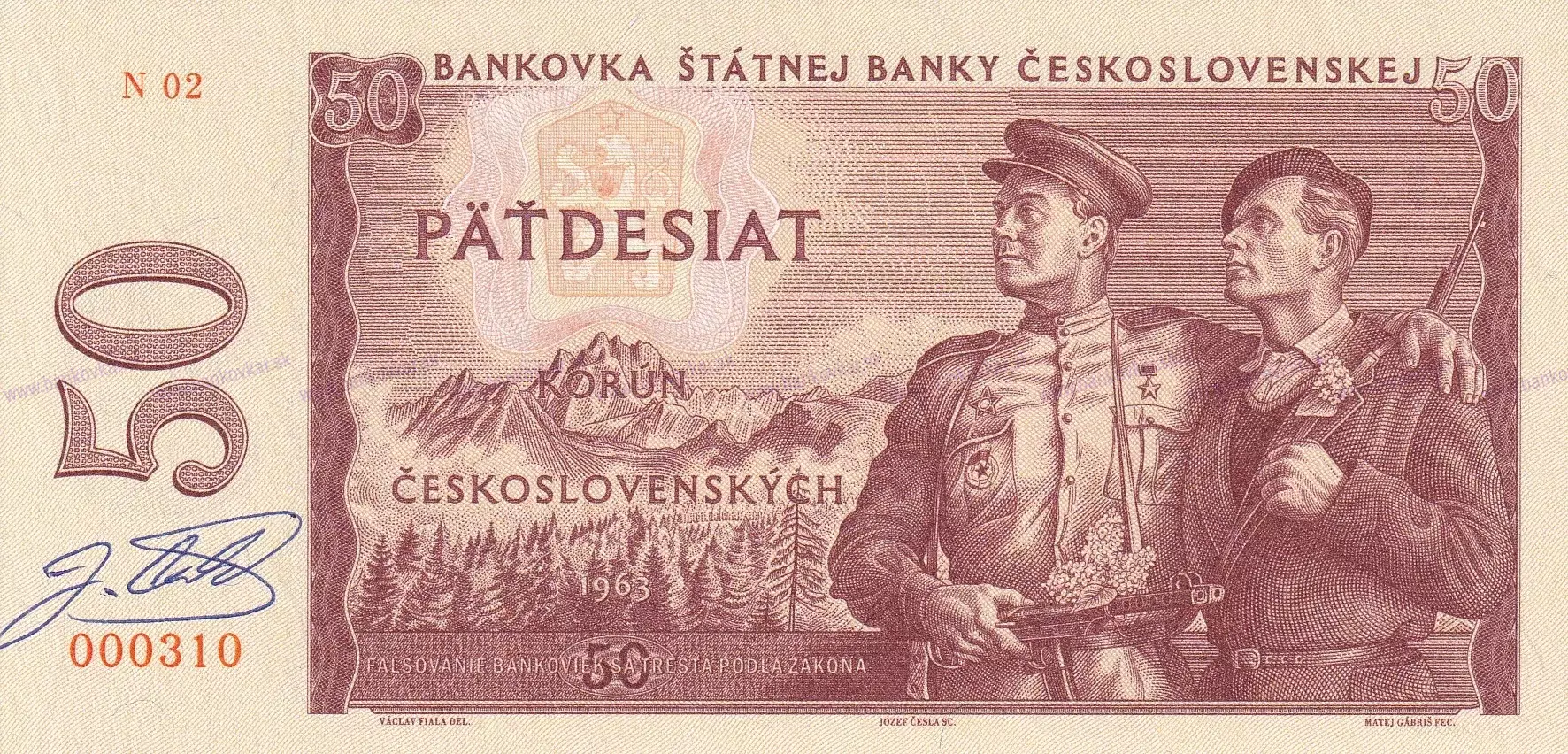 Reálna bankovka bola vydaná v roku 1964 a v obehu bola od 1.4.1965 až do 30.6.1991. Na lícovej strane sú dve postavy, sovietsky vojak a partizán s pozadím horskej krajiny. Na rubovej strane známa rafinéria minerálnych olejov Slovnaft v Bratislave. Autorom realizovaného návrhu bankovky bol Václav Fiala. V skutočnosti ale navrhol tento autor inú podobu, ktorá bola datovaná r.1963, ale nebola nikdy schválená a od realizovaných verzií sa výrazne líši v mnohých pohľadoch. V Českej národnej banke je uložená ceruzkou vyhotovená škica, vykreslená do konečných detailov, ktorá ale nebola chválená na realizáciu, a autor bol donútený vytvoriť tú známu a vydanú obehovú verziu. Teda až doteraz. Múzeum cenných papierov po dohode s ČNB a so súhlasom dedičov autorských práv využilo túto škicu a dokončilo bankovku rovnakým spôsobom, ako by sa postupovalo v tej dobe a ako by vyzerala vtedy realizovaná verzia podľa dochovaného návrhu. Bankovka je síce novotlačou, ale nikdy nerealizovanej podoby, takže nejde o dotlač alebo novotlač pôvodnej bankovky. S využitím všetkých dostupných archívnych materiálov ide o vytvorenie vernej rekonštrukcie, tak ako bankovka mala/mohla vyzerať. Riaditeľ MCP Rudolf Píša - “...prirodzene sme bankovku museli v niektorých častiach dotvoriť, ale zároveň sme iné časti ponechali i s určitými chybami - napr. slovensky je správny názov "Švermove závody...", ale autor ponechal v návrhu česky zkomolený "Švermovy". Grafickej práce se ujali slovenskí majstri svojho odboru - ryteckého prepisu náročných kresieb se ujal rytec Mgr.art. Jozef Česla, ceninovej podoby a ochranných prvkov grafik Matej Gábriš. Tlač vykonala ofsetom ceninová tlačiareň DAS Security Printing, nová bankovka má 15 ochranných prvkov.