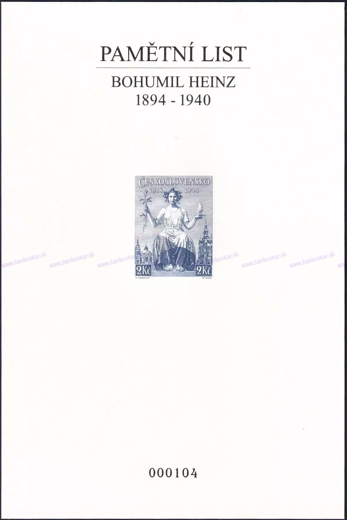 | Zadná strana: | Hlavným motívom, okrem poštovej známky, je samotná osobnosť Bohumila Heinza a jeho práca, ktorá je zobrazená na rubovej strane spoločne s motívom, ktorý vytvoril pre Národnú banku Československú. |